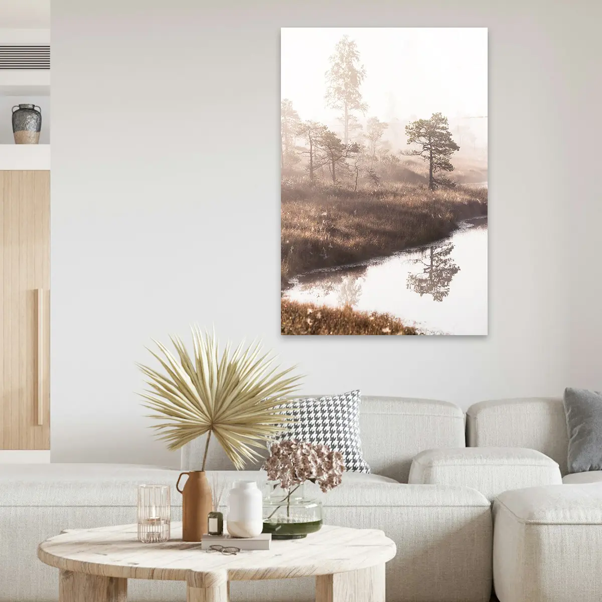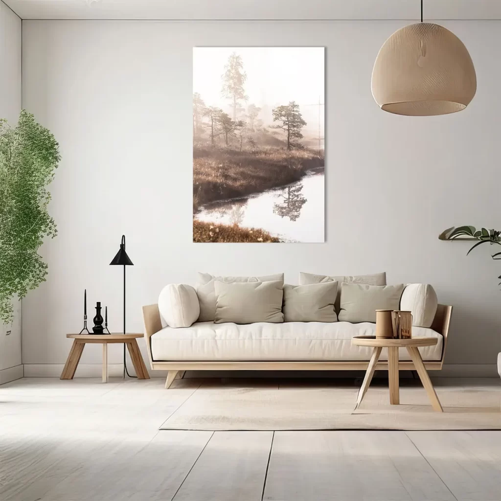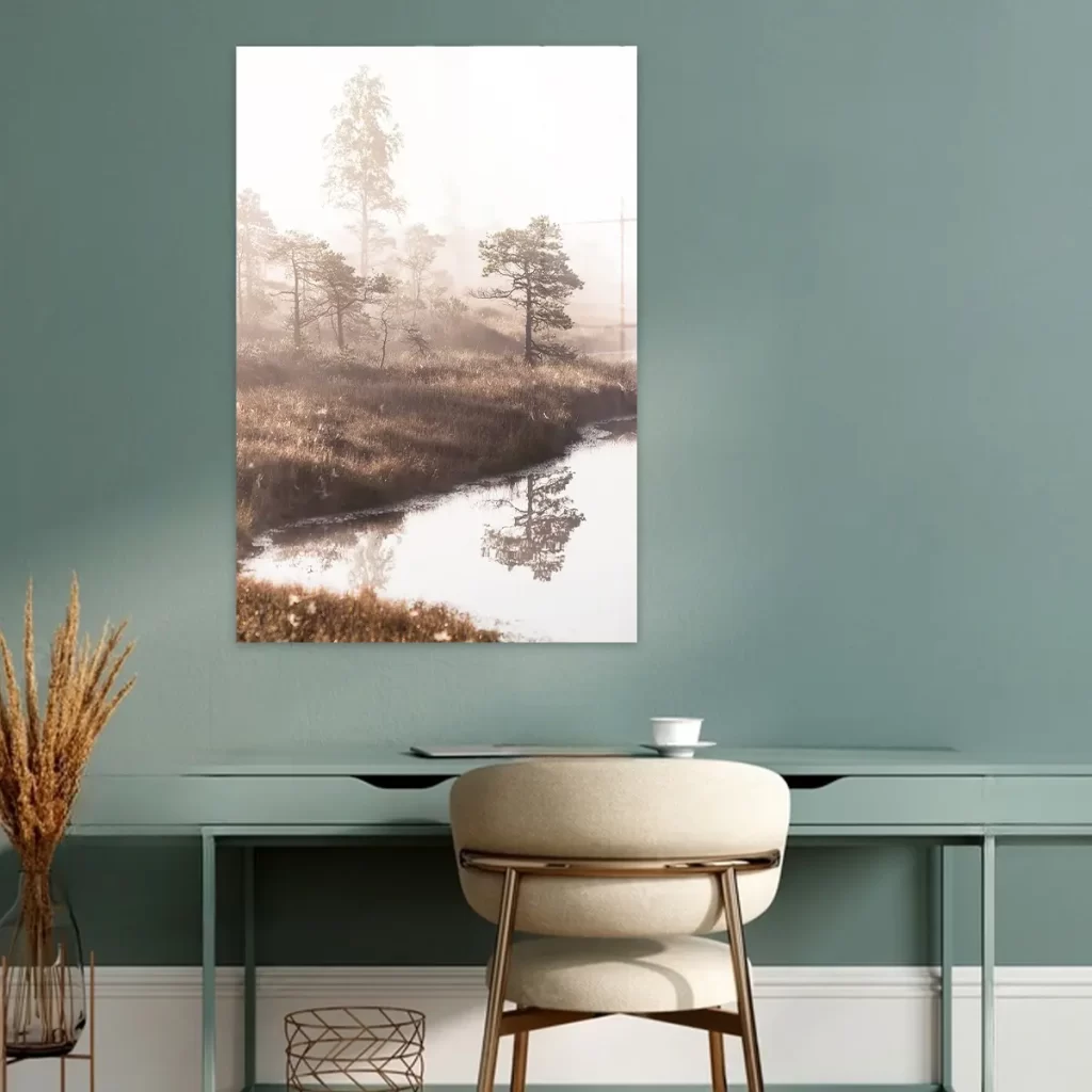 Een dromerig landschap waar dennenbomen zich spiegelen in stil water, gehuld in zachte ochtendmist. De warme zonnestralen die door de mist schijnen creëren een magisch moment. Deze wanddecoratie brengt de serene rust van een vroege ochtend in de natuur naar binnen.