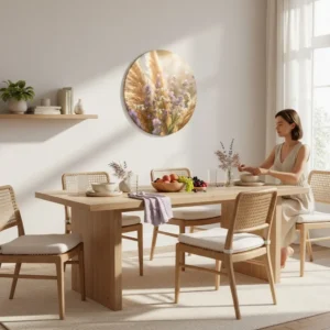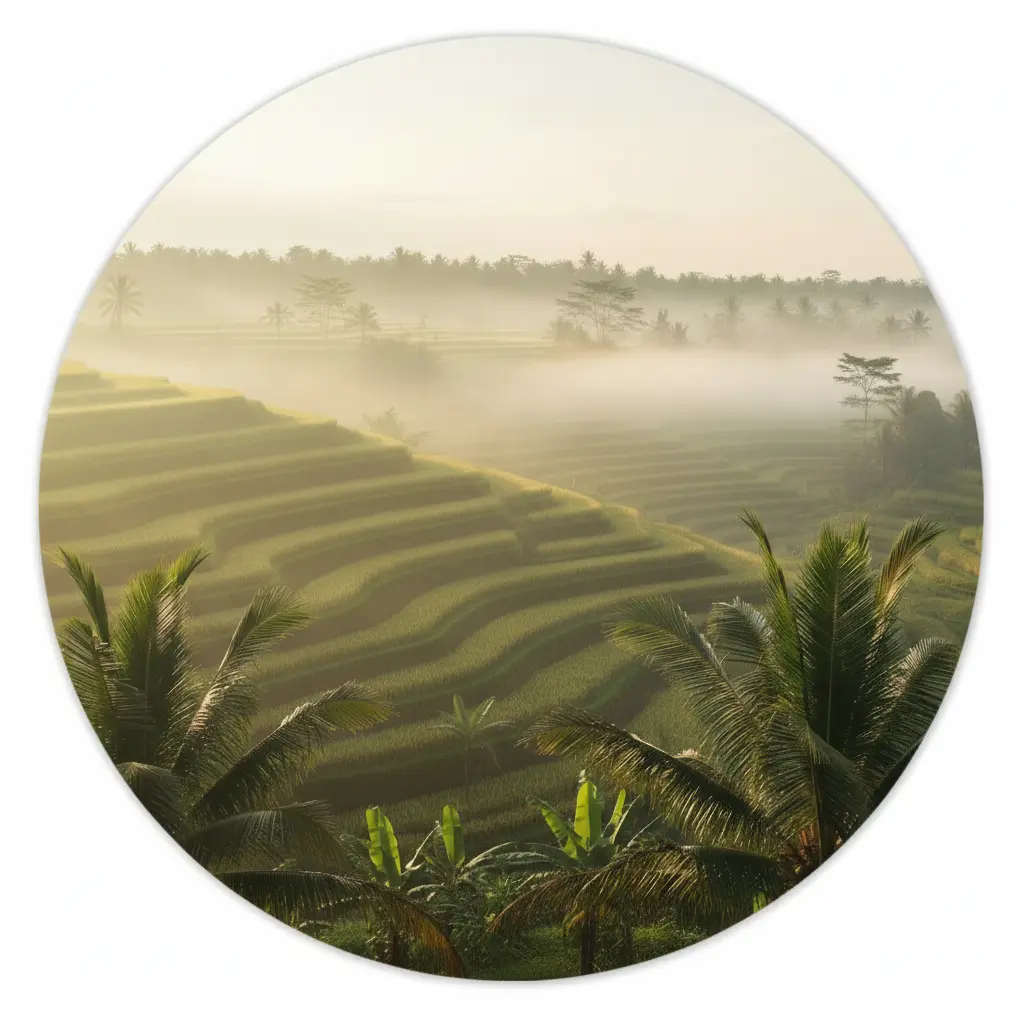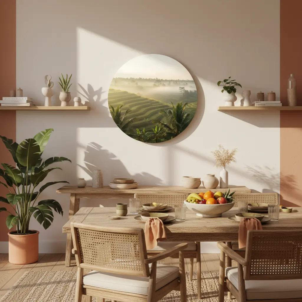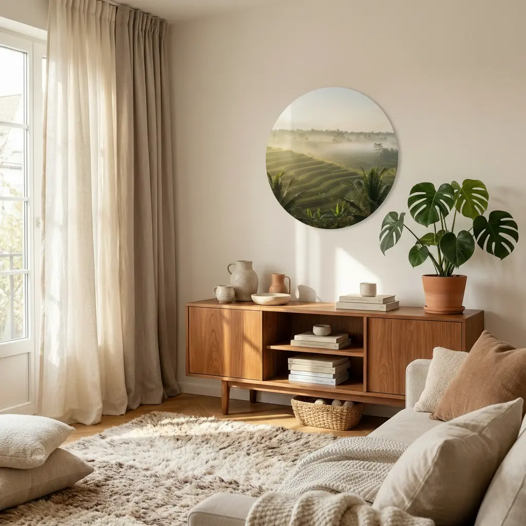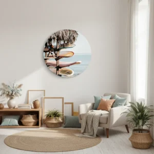 De palmbladeren op de voorgrond geven diepte en een natuurlijke framing, terwijl de matte fine-art uitstraling zorgt voor een rustige, premium look. Deze muurcirkel brengt een ontspannen, zonnige reissfeer in huis en past prachtig bij natuurlijke materialen zoals hout, linnen en rotan. Mooi in de woonkamer, slaapkamer of eetkamer.