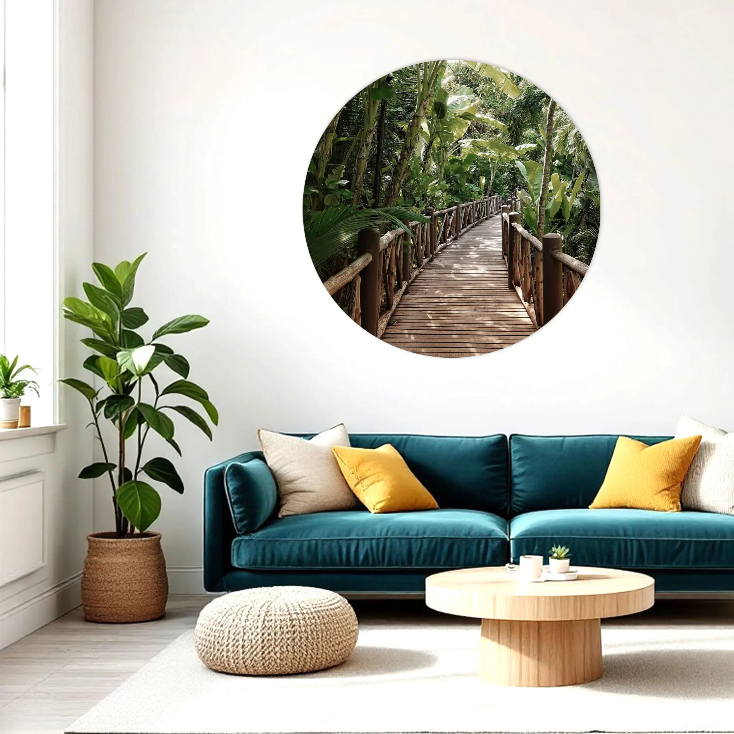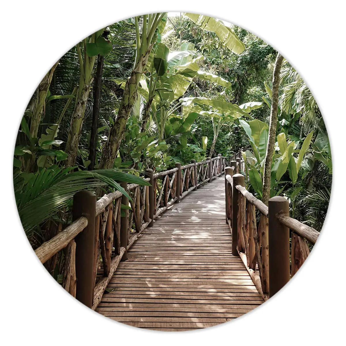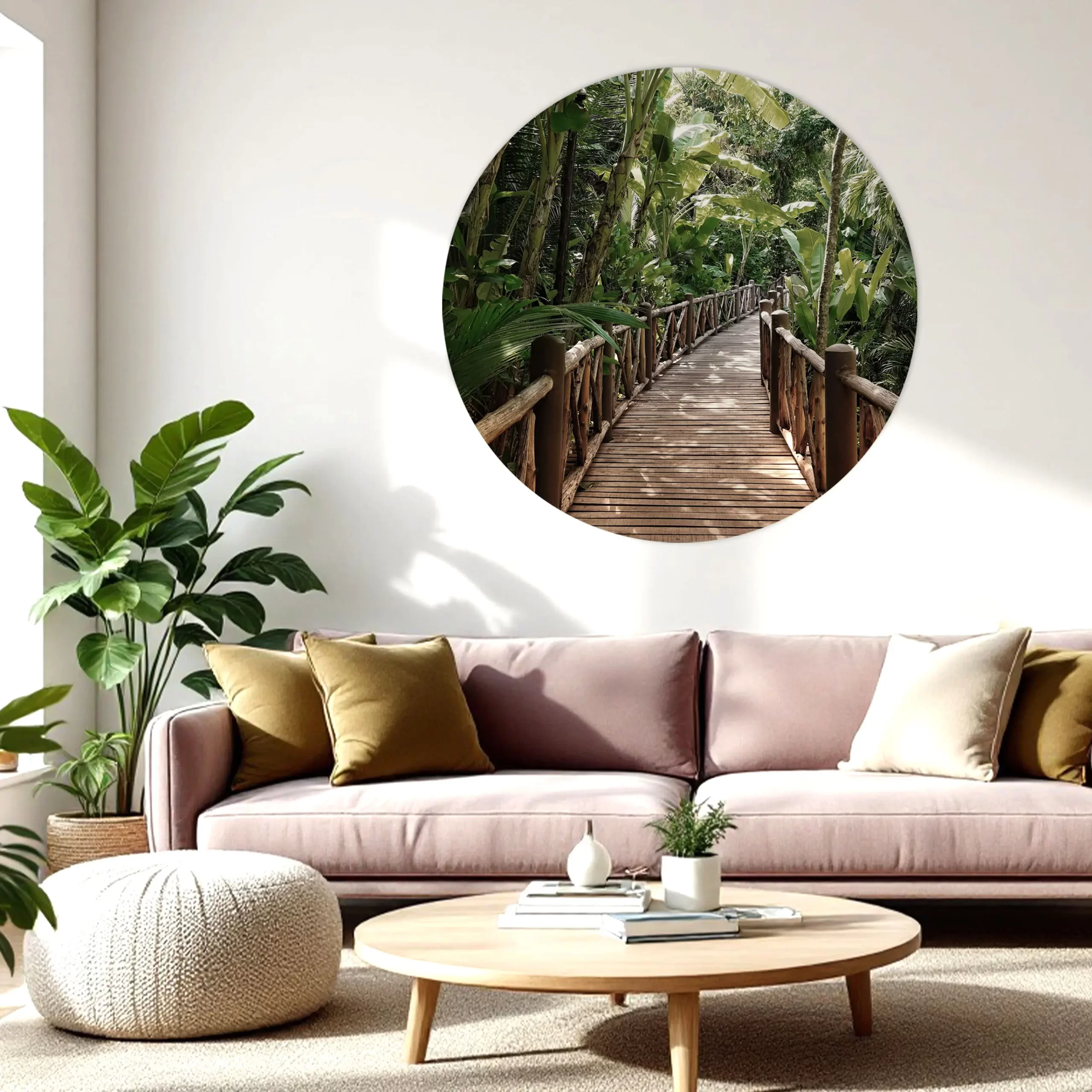 Een uitnodigende houten brug die zich door een weelderige tropische jungle slingert. De rijke groentinten van de palmbladeren en bananenbomen creëren een natuurlijk baldakijn, terwijl het houten pad een gevoel van avontuur en ontdekkingsreis oproept. Als wanddecoratie brengt deze print een vleugje exotische rust en natuurlijke schoonheid in elk interieur, perfect voor een tropisch of natuurlijk geïnspireerd thema.