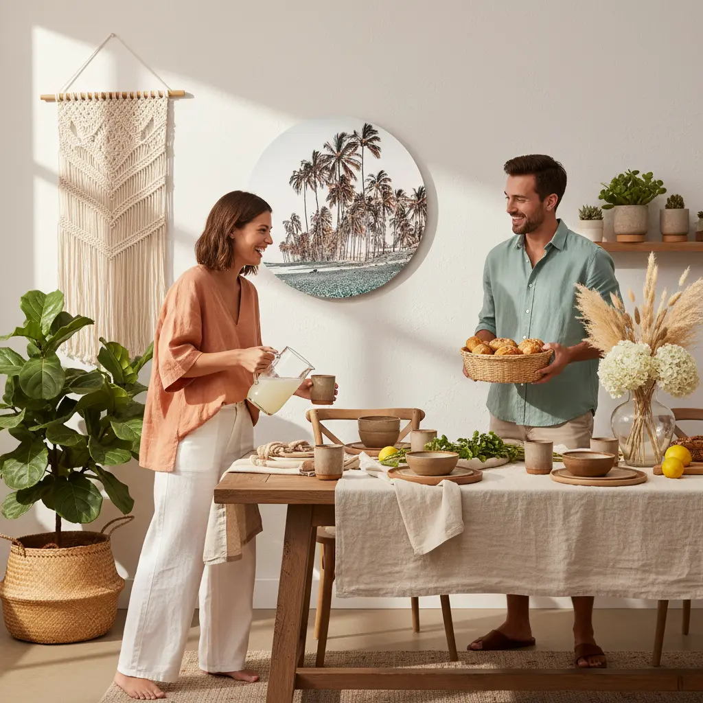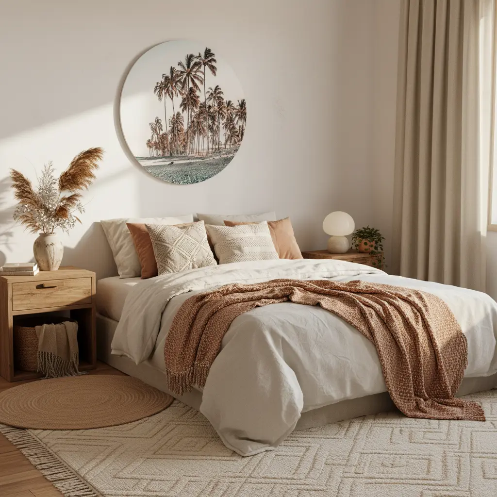 Zachte strandfotografie met palmbomen in warme, rustige tinten. Geeft je interieur een relaxte, zomerse sfeer met een subtiele boho touch.