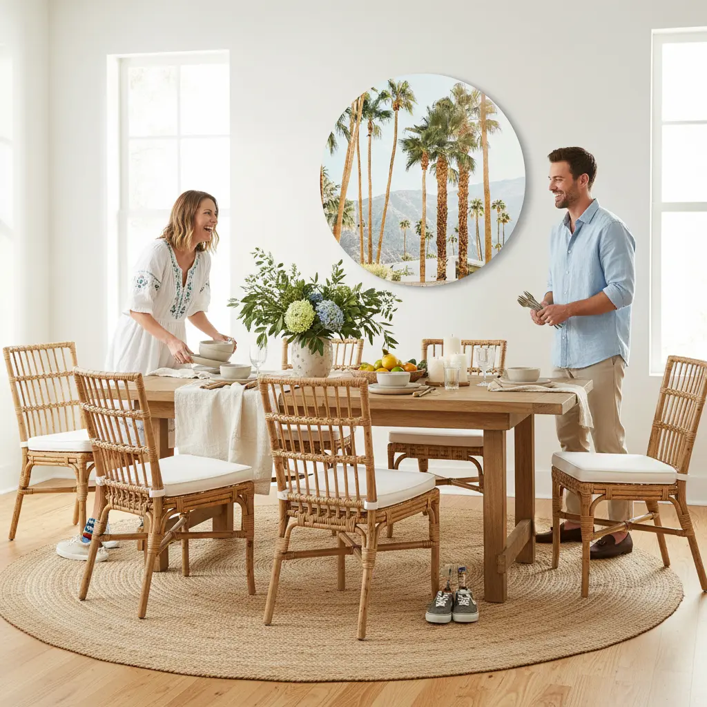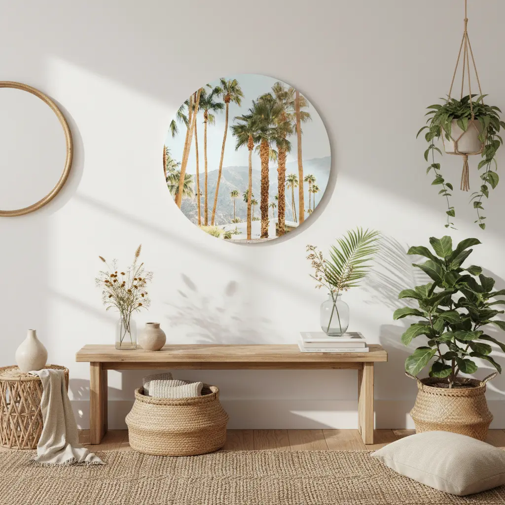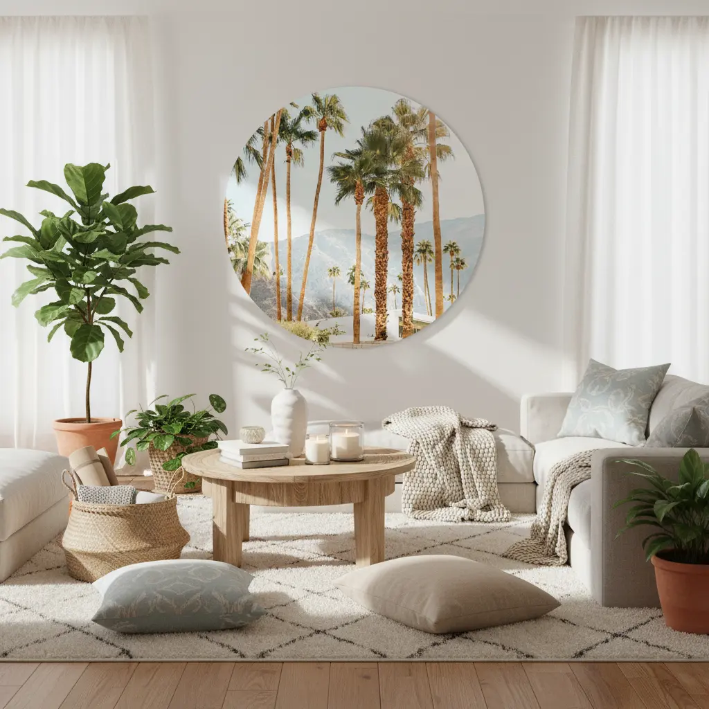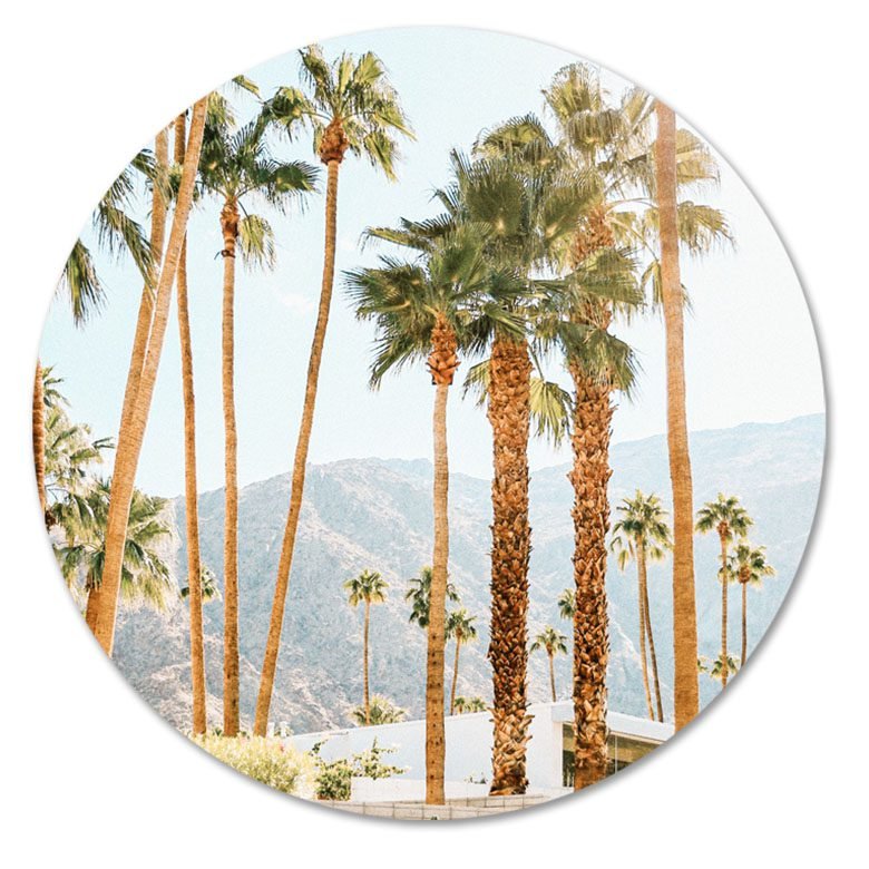 Zonnige palmbomenfoto met een frisse, lichte lucht en bergen op de achtergrond voor een echte California vibe. Geeft je interieur direct een warme, luchtige uitstraling en past perfect bij natuurlijke materialen en lichte kleuren.