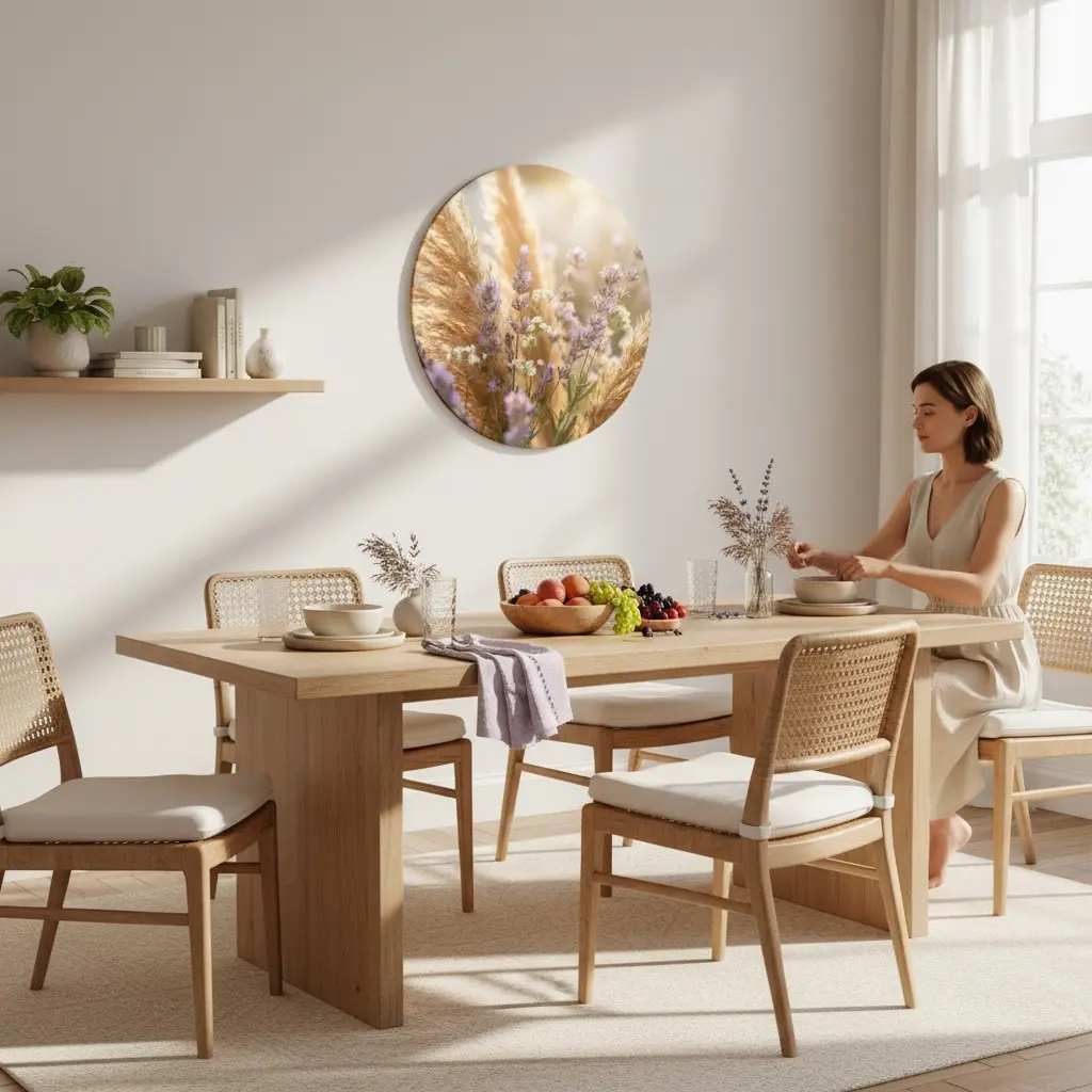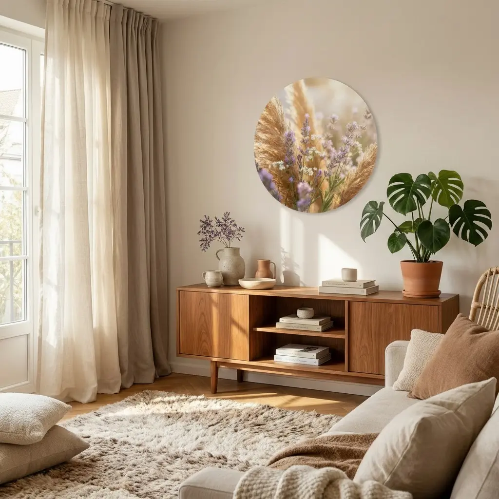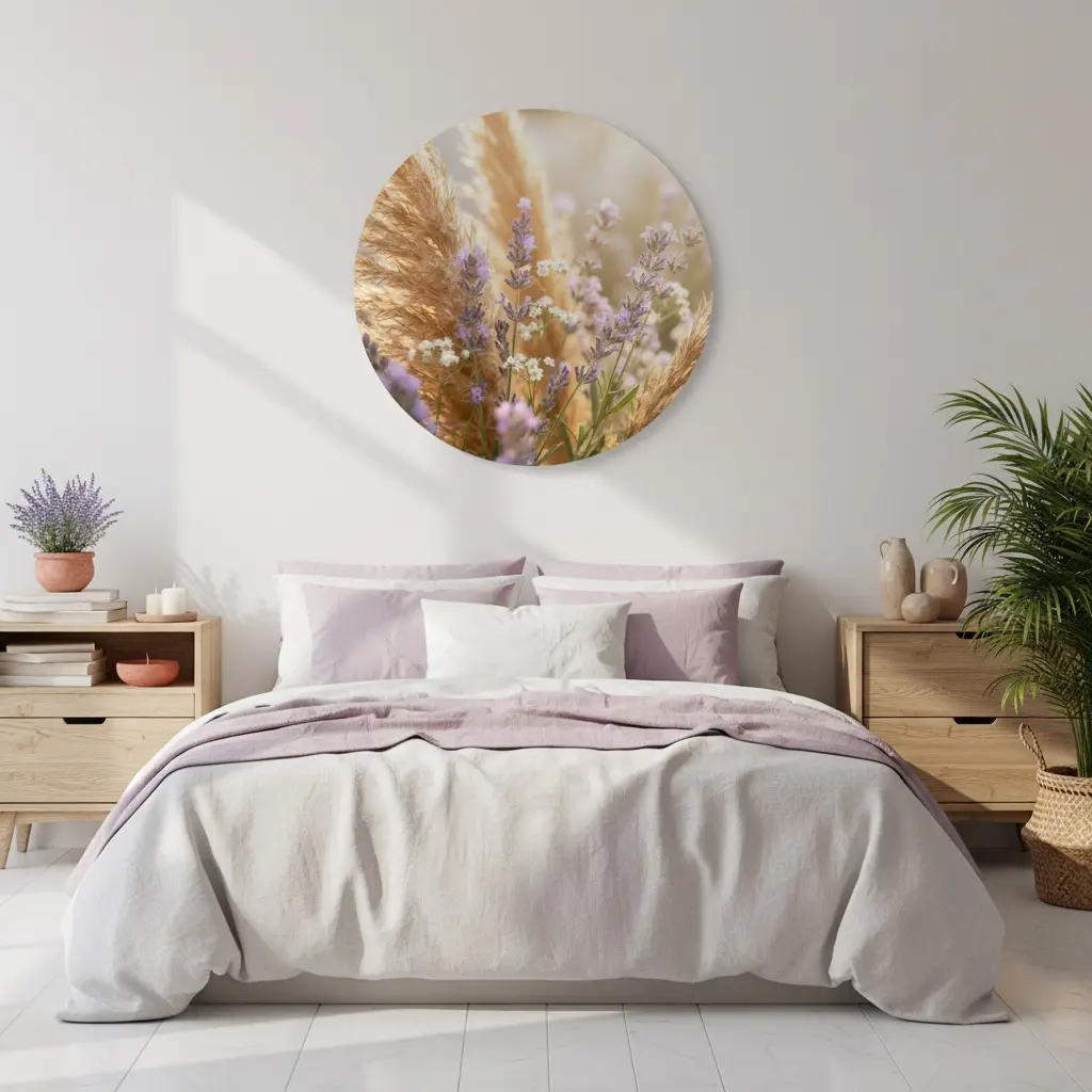 Een zachte fotokunst print met pampaspluimen en lavendel in warm zomerlicht, met een dromerige bokeh en natuurlijke texturen. De matte fine-art uitstraling en rustige zandtinten met een subtiel lila accent geven deze muurcirkel een premium boho look.