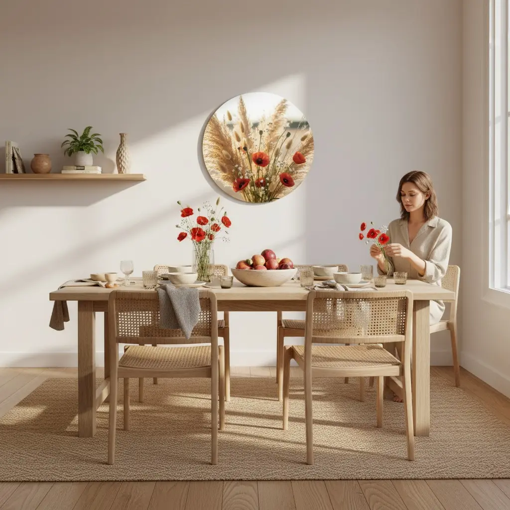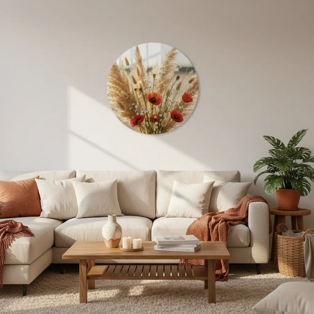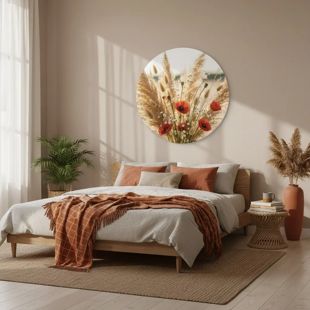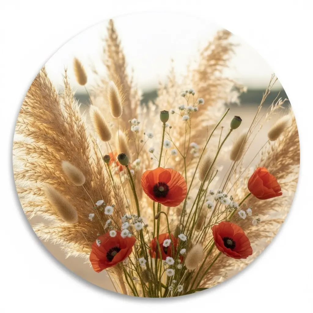 Een warme fotokunst print met pampas en een subtiele wilde klaproos, gevangen in een gouden zomergloed met zachte bokeh en natuurlijke texturen. De matte fine-art uitstraling en rustige zandtinten geven deze muurcirkel een premium boho look, met net genoeg roest/oranje als verfijnd accent.