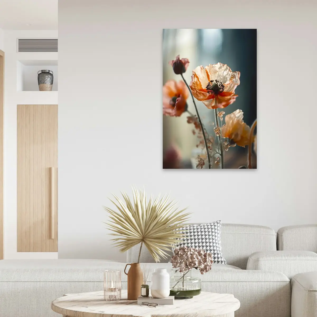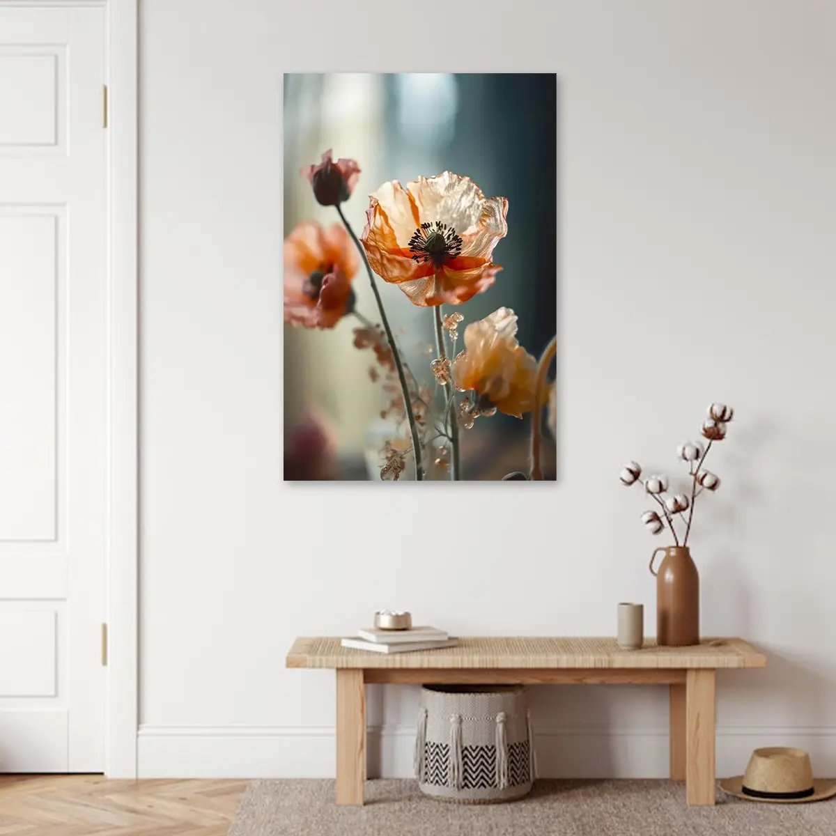 Deze verfijnde papaverbloem, vastgelegd in warm ochtendlicht, straalt een serene elegantie uit. De delicate, zalmroze bloemblaadjes lijken bijna doorschijnend en creëren een dromerige sfeer in elk interieur. Als wanddecoratie brengt dit kunstwerk rust en natuurlijke zachtheid in je ruimte