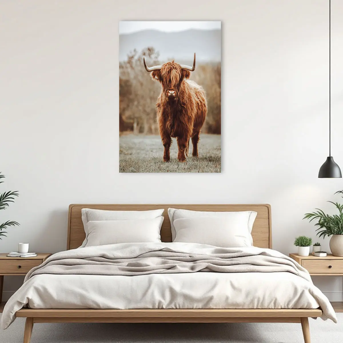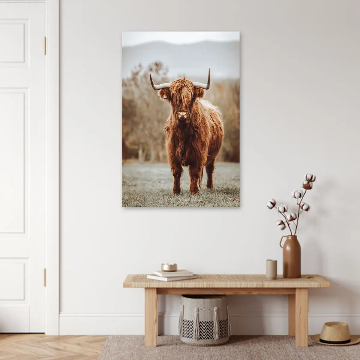 Een natuurlijk kunstwerk van een Schotse Hooglander omringd door bomen en heuvels. De warme, aardse tinten van de foto geven een gevoel van rust en sereniteit.