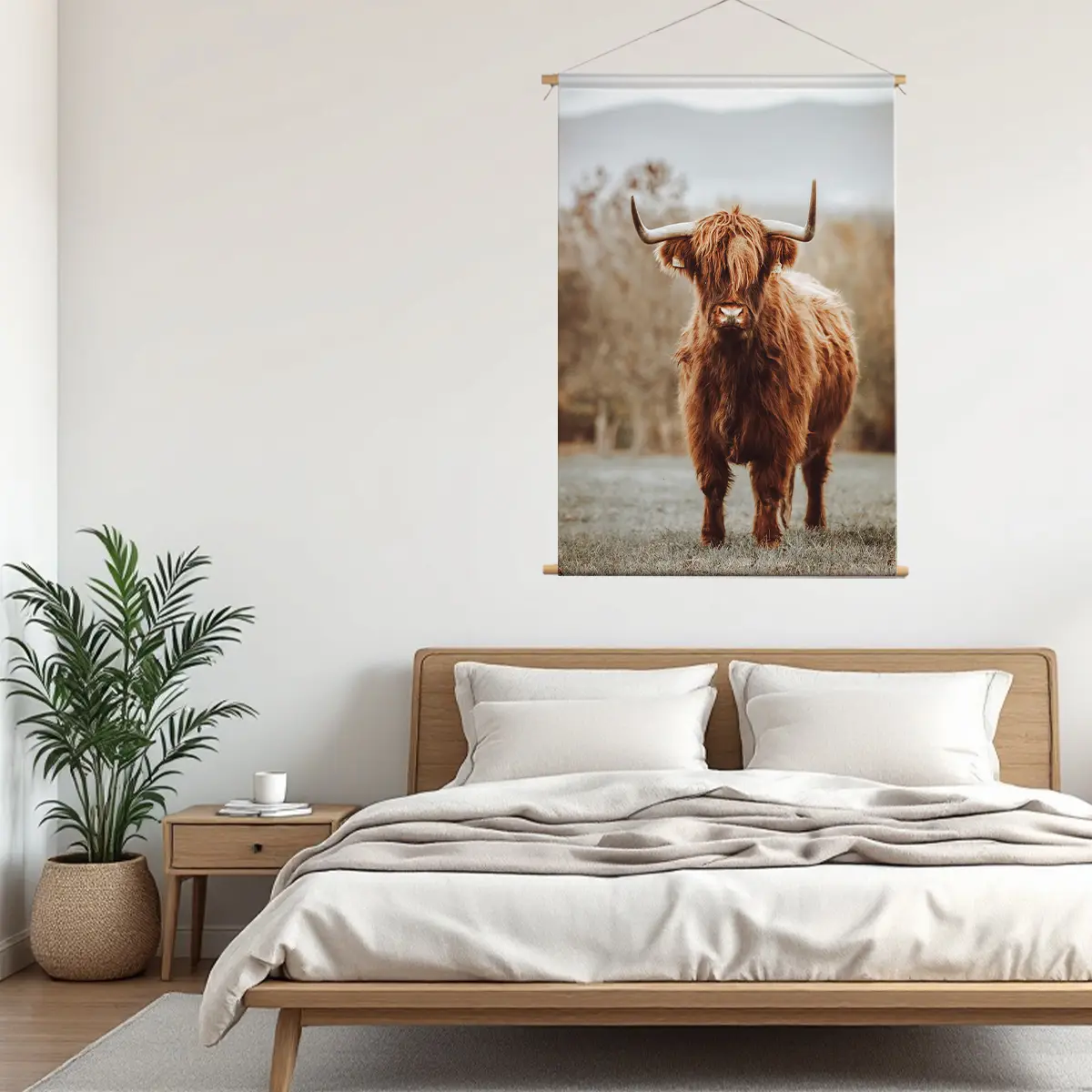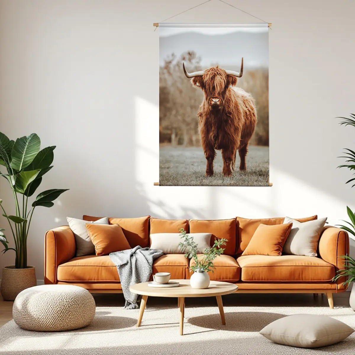 Een natuurlijk kunstwerk van een Schotse Hooglander omringd door bomen en heuvels. De warme, aardse tinten van de foto geven een gevoel van rust en sereniteit.