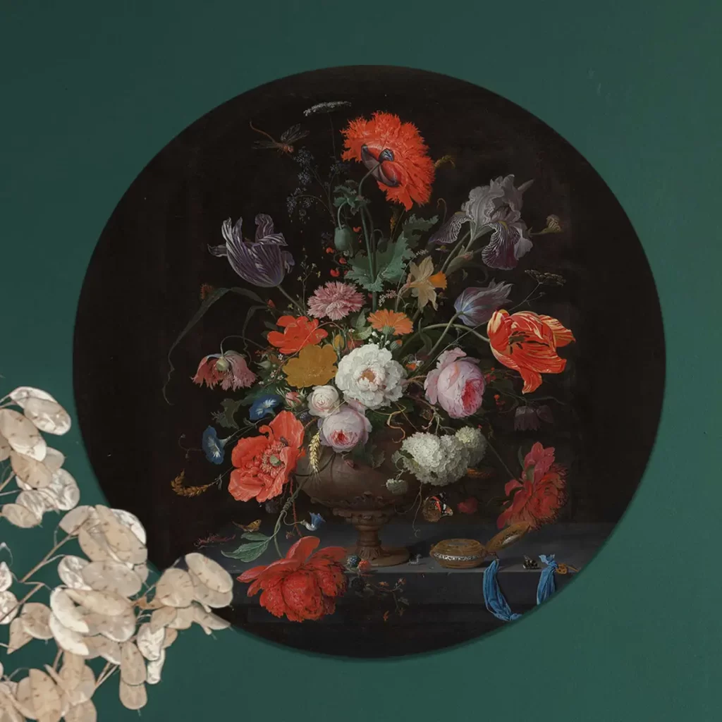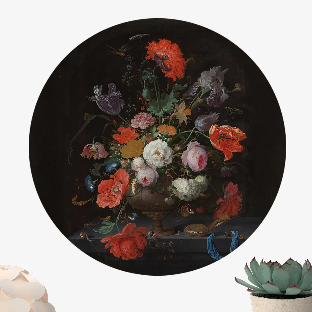 Stilleven met bloemen en een horloge. Op een stenen plint ligt een gouden horloge met blauw lint naast een boeket bloemen (tulpen, rozen, papavers, anemonen, narcissen en irissen) in een vaas. Tussen de bloemen en op de plint bevinden zich slakken, rupsen, een hommel en een libel.