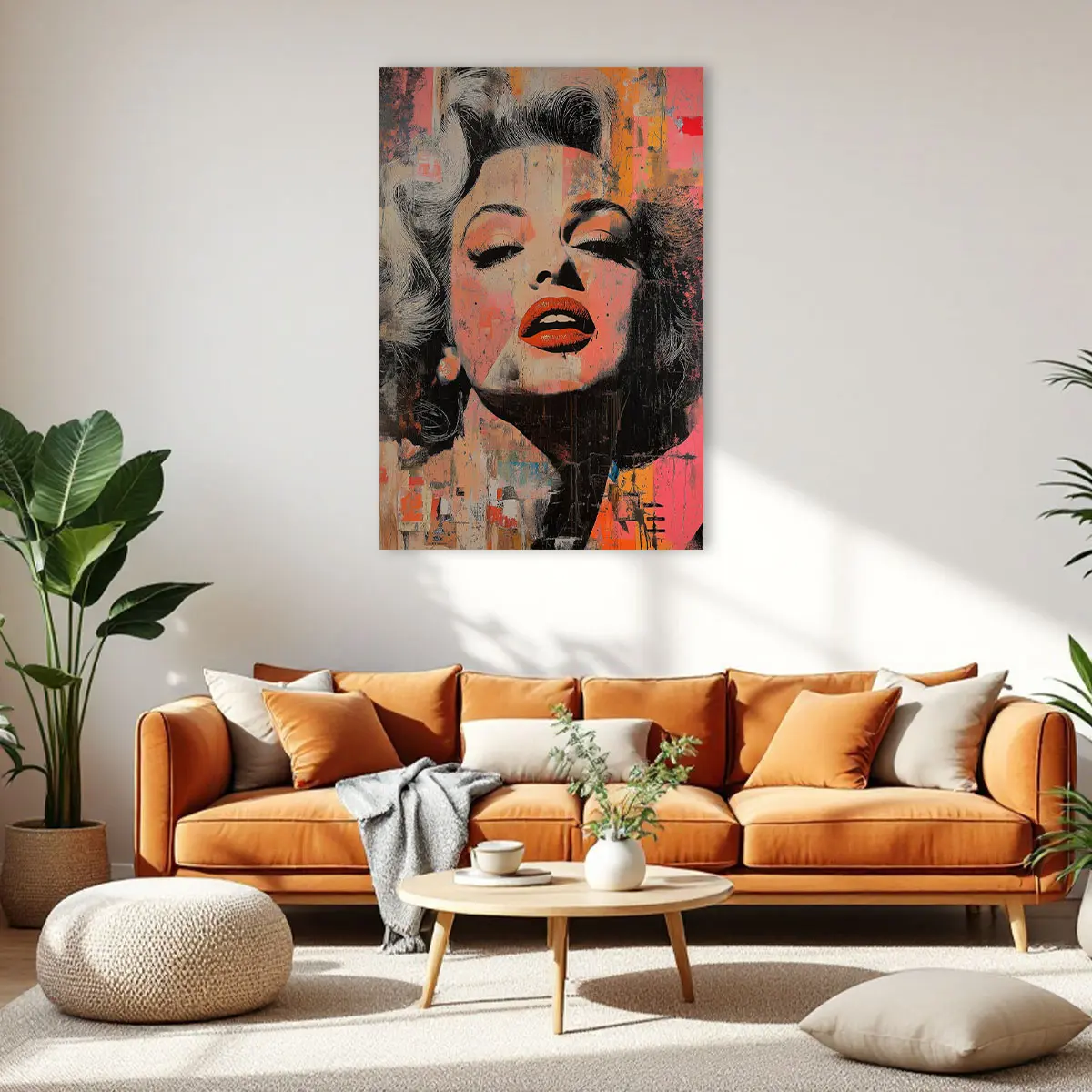 Een expressieve street art interpretatie van een Marilyn Monroe portret met opvallende rode lippen en verweerde texturen. De warme oranje en roze tinten gecombineerd met de ruwe, artistieke afwerking creëren een krachtig en emotioneel kunstwerk. Deze print brengt een vleugje urbane kunst en moderne expressie in huis, ideaal voor een eigentijds of industrieel interieur.