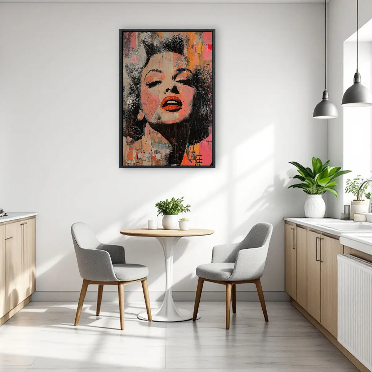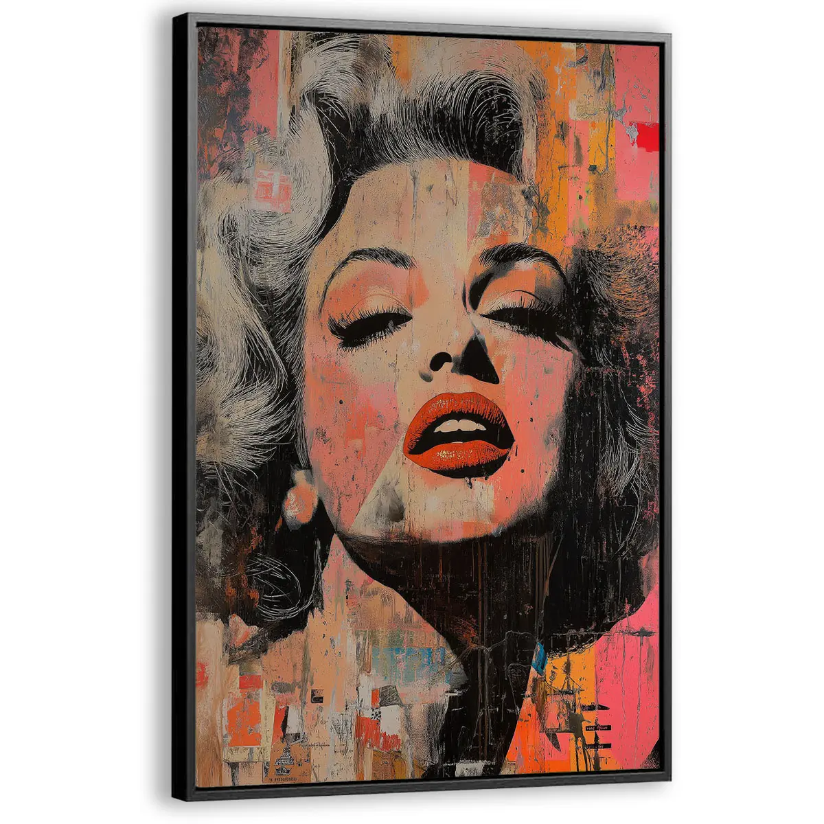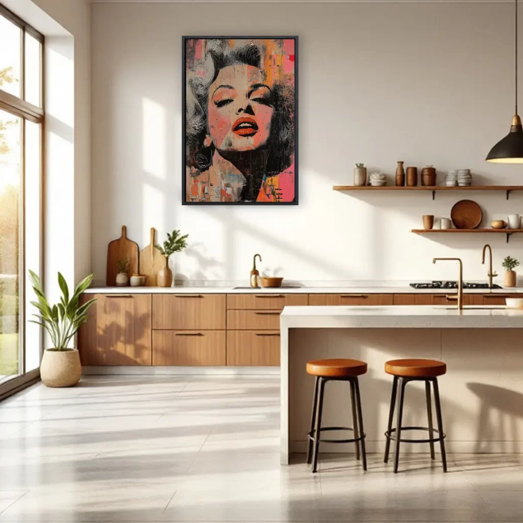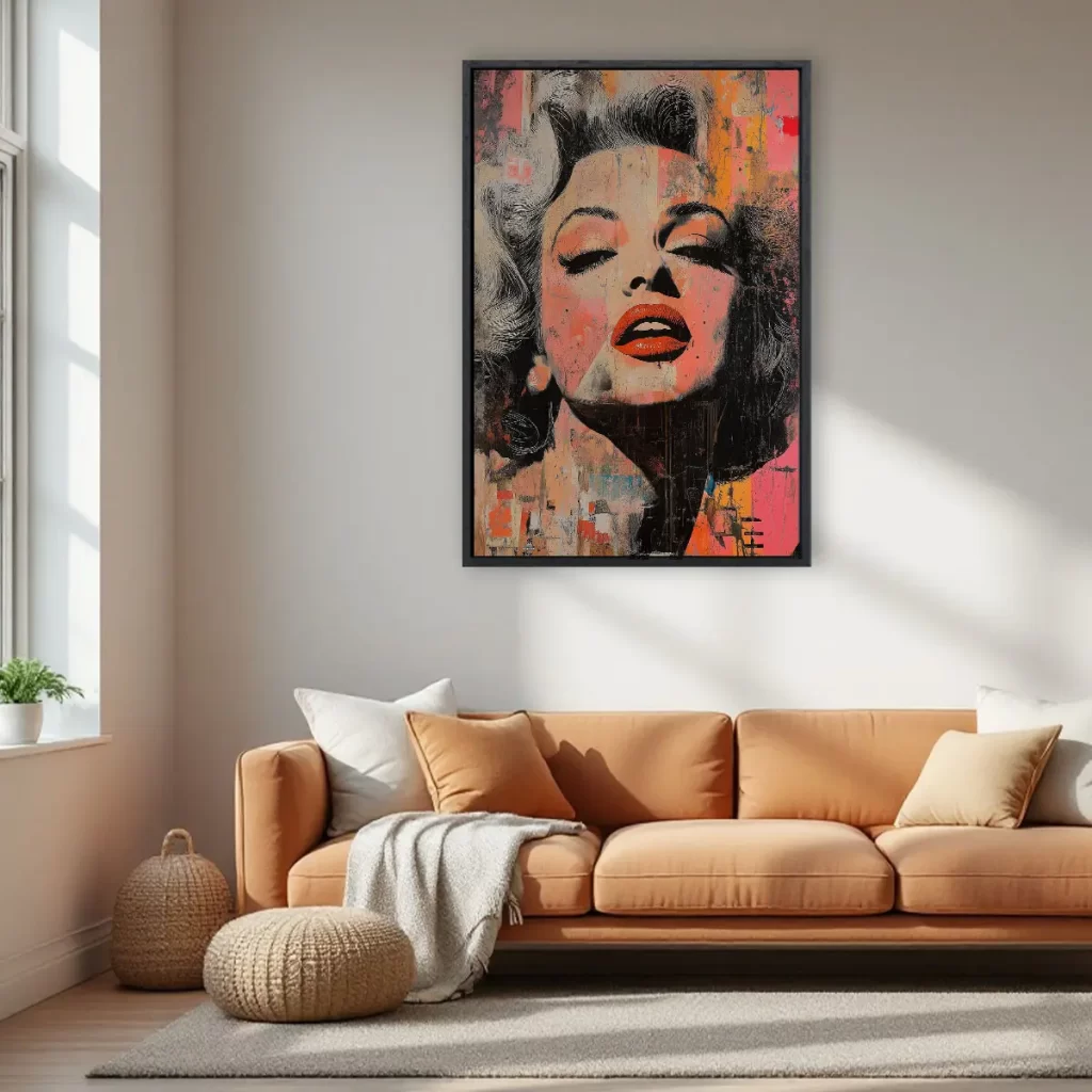 Een expressieve street art interpretatie van een Marilyn Monroe portret met opvallende rode lippen en verweerde texturen. De warme oranje en roze tinten gecombineerd met de ruwe, artistieke afwerking creëren een krachtig en emotioneel kunstwerk. Deze print brengt een vleugje urbane kunst en moderne expressie in huis, ideaal voor een eigentijds of industrieel interieur.