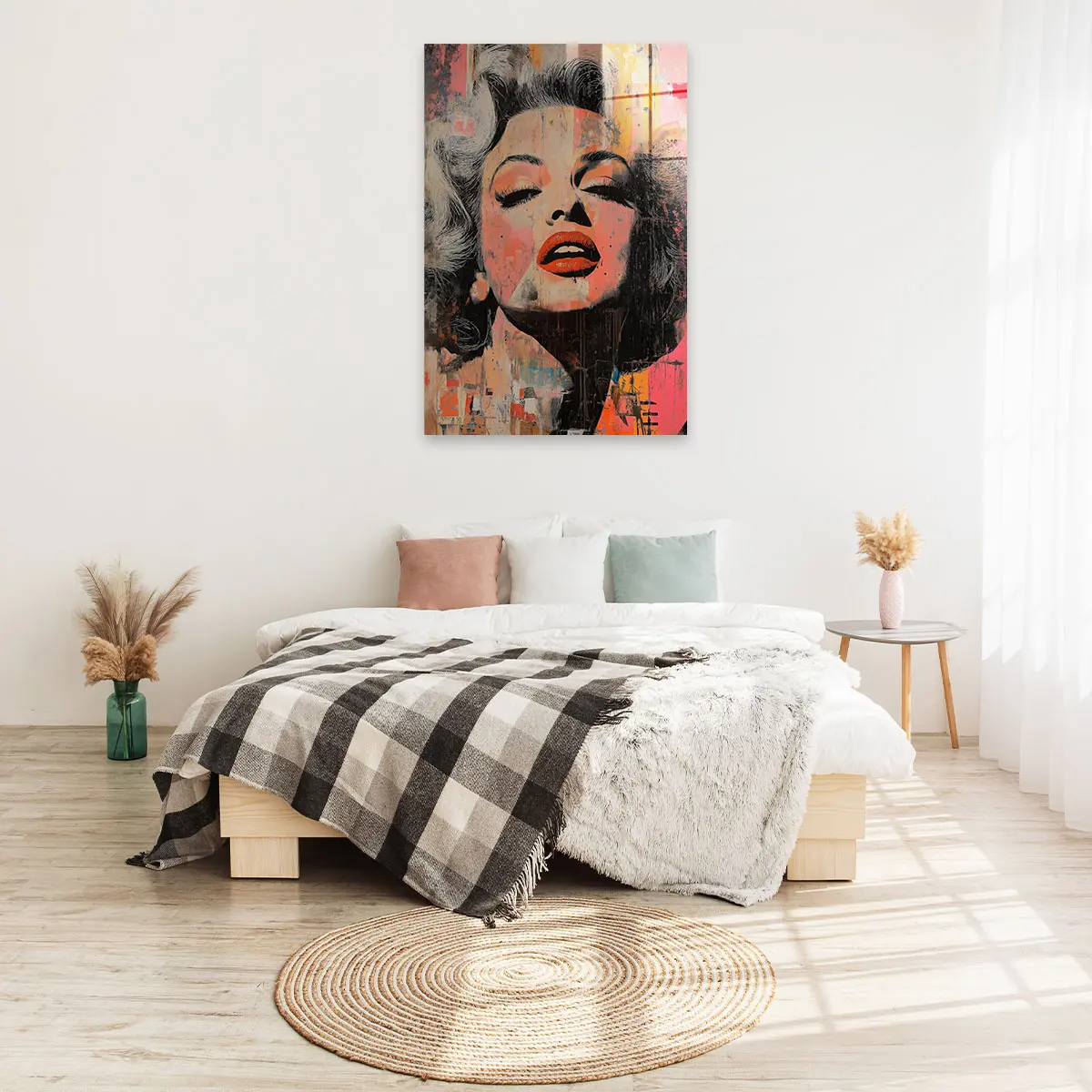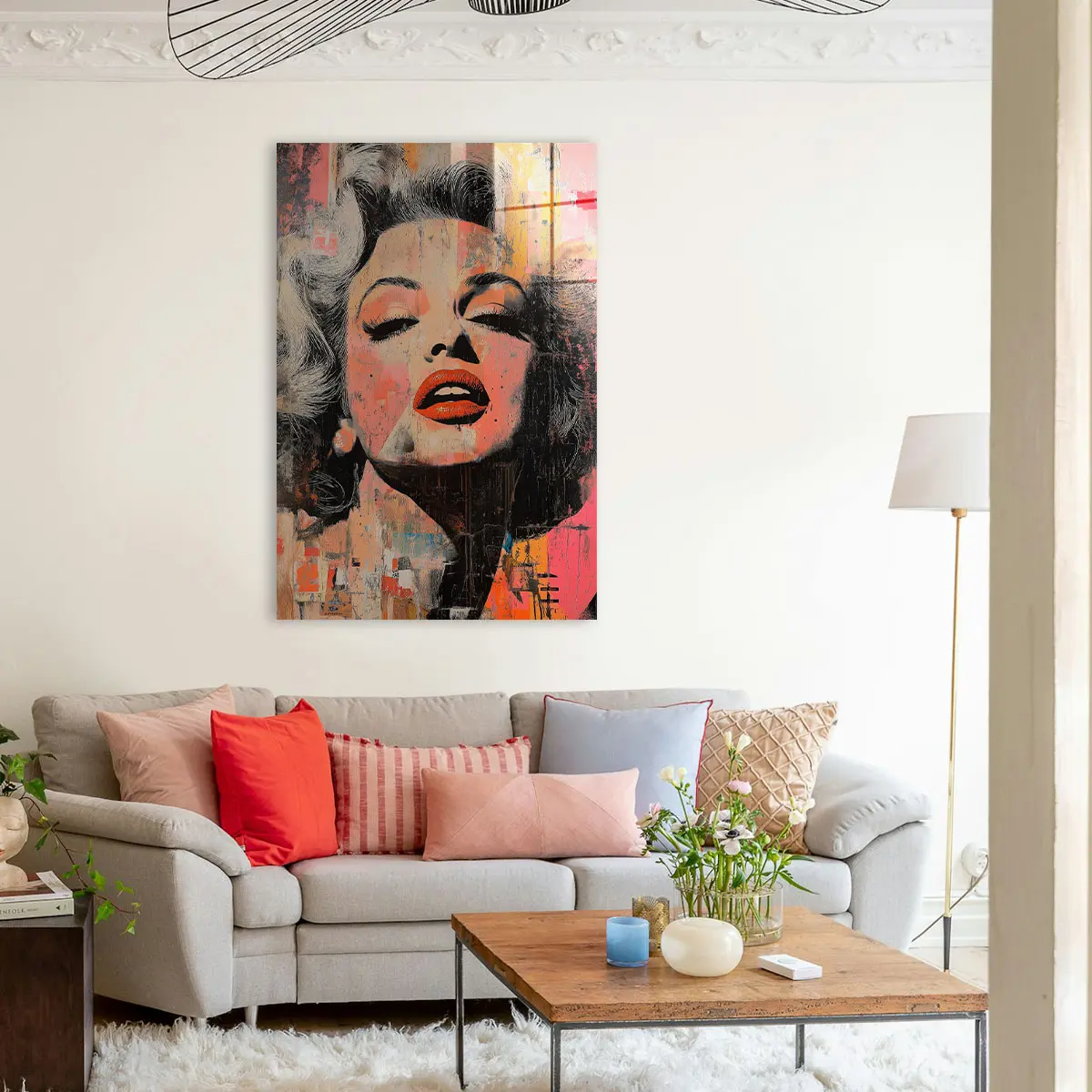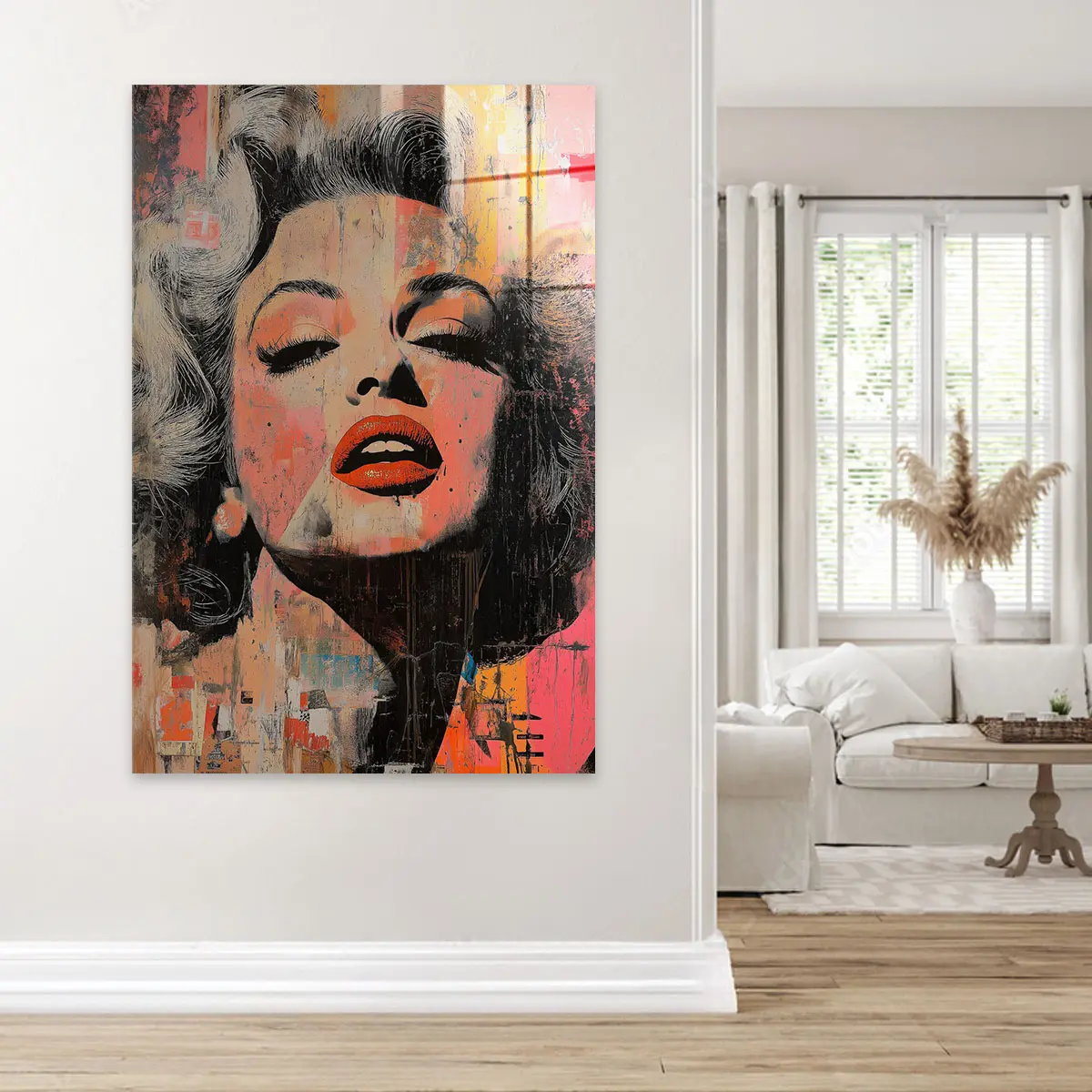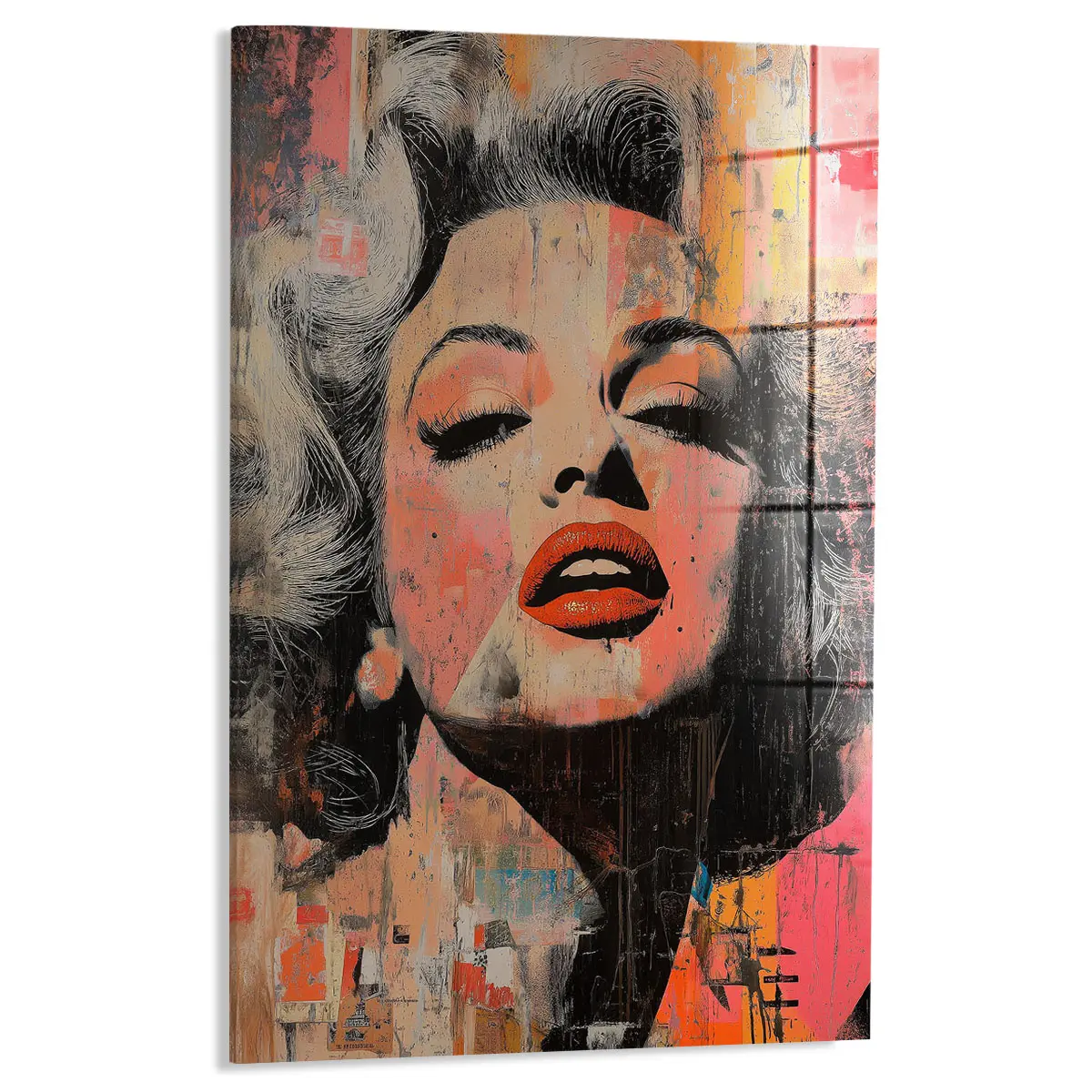 Een expressieve street art interpretatie van een Marilyn Monroe portret met opvallende rode lippen en verweerde texturen. De warme oranje en roze tinten gecombineerd met de ruwe, artistieke afwerking creëren een krachtig en emotioneel kunstwerk. Deze print brengt een vleugje urbane kunst en moderne expressie in huis, ideaal voor een eigentijds of industrieel interieur.