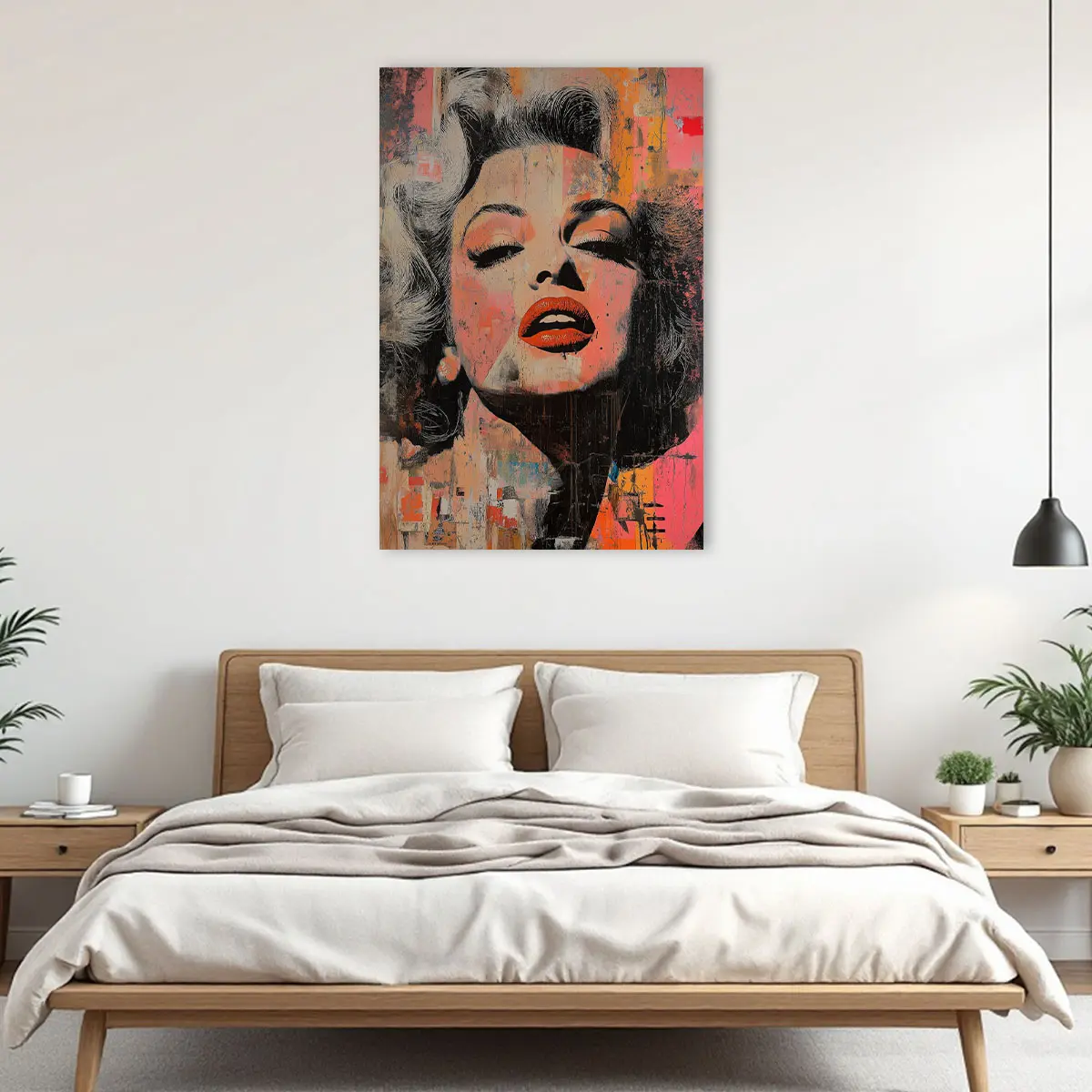 Een expressieve street art interpretatie van een Marilyn Monroe portret met opvallende rode lippen en verweerde texturen. De warme oranje en roze tinten gecombineerd met de ruwe, artistieke afwerking creëren een krachtig en emotioneel kunstwerk. Deze print brengt een vleugje urbane kunst en moderne expressie in huis, ideaal voor een eigentijds of industrieel interieur.