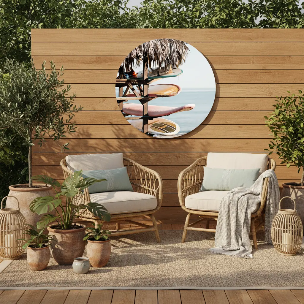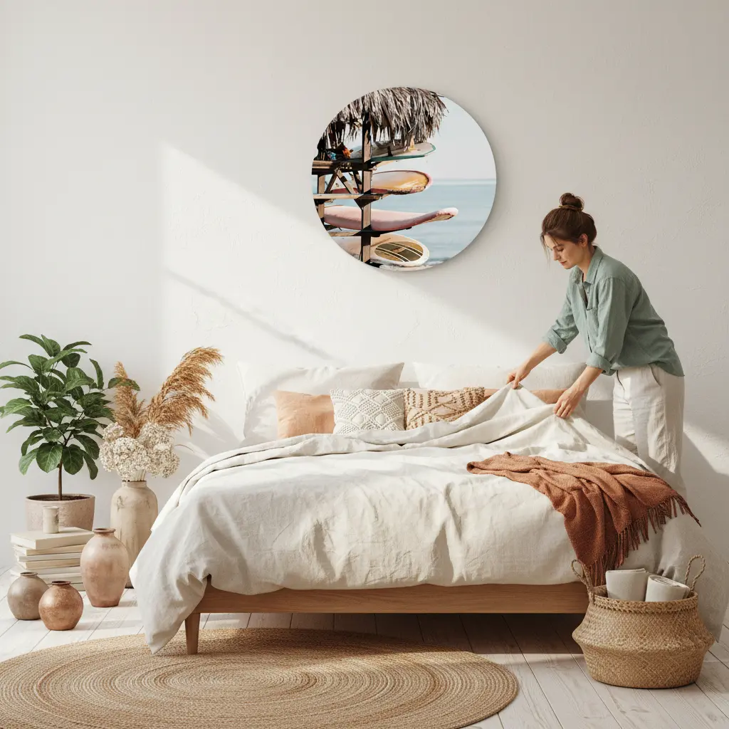 Luchtige kustfotografie met surfboards onder een strandhut en zachte pastelkleuren. Geeft je interieur een speelse, ontspannen beach vibe met een warme uitstraling.