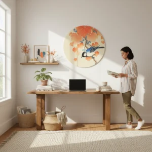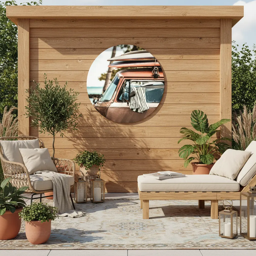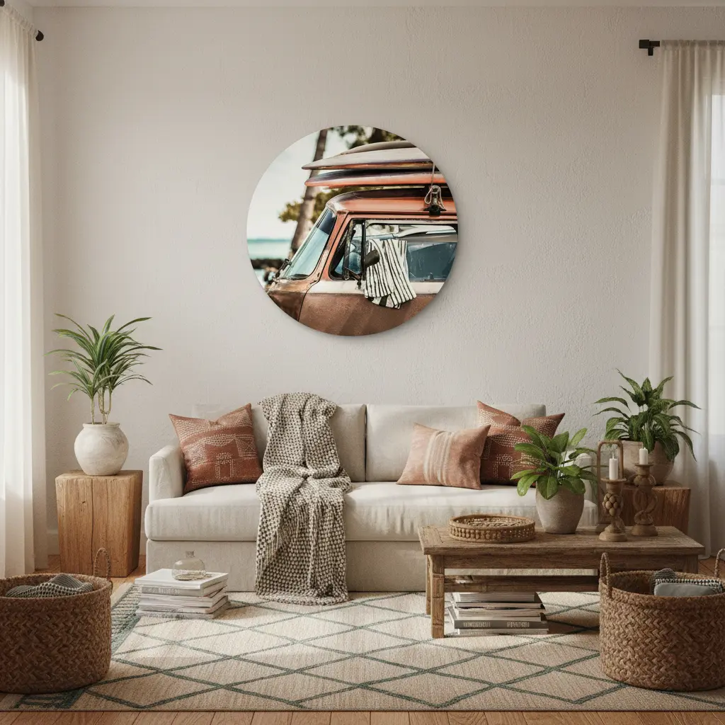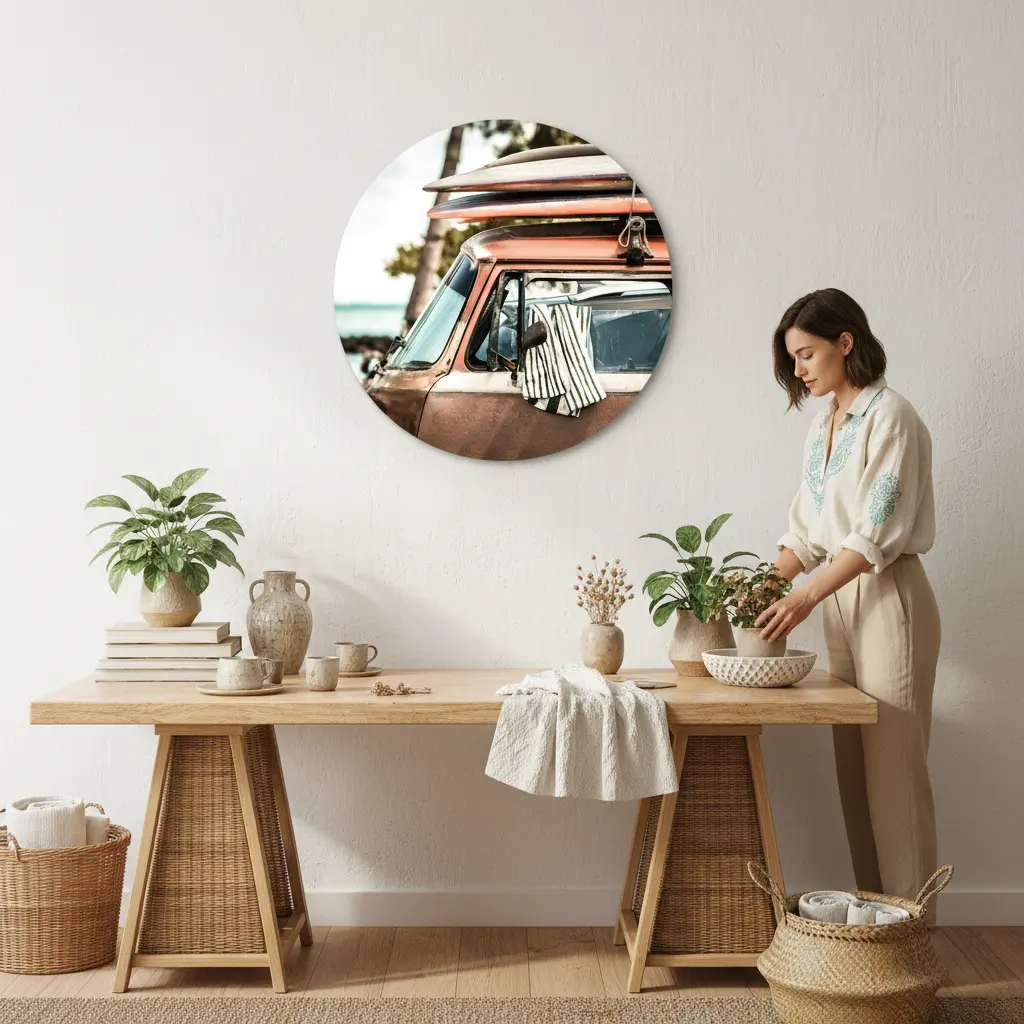 Zomerse coastal foto van een vintage surfbus met surfboards en zachte strandtinten. Geeft je interieur een relaxte beach vibe met een warme, nostalgische uitstraling.