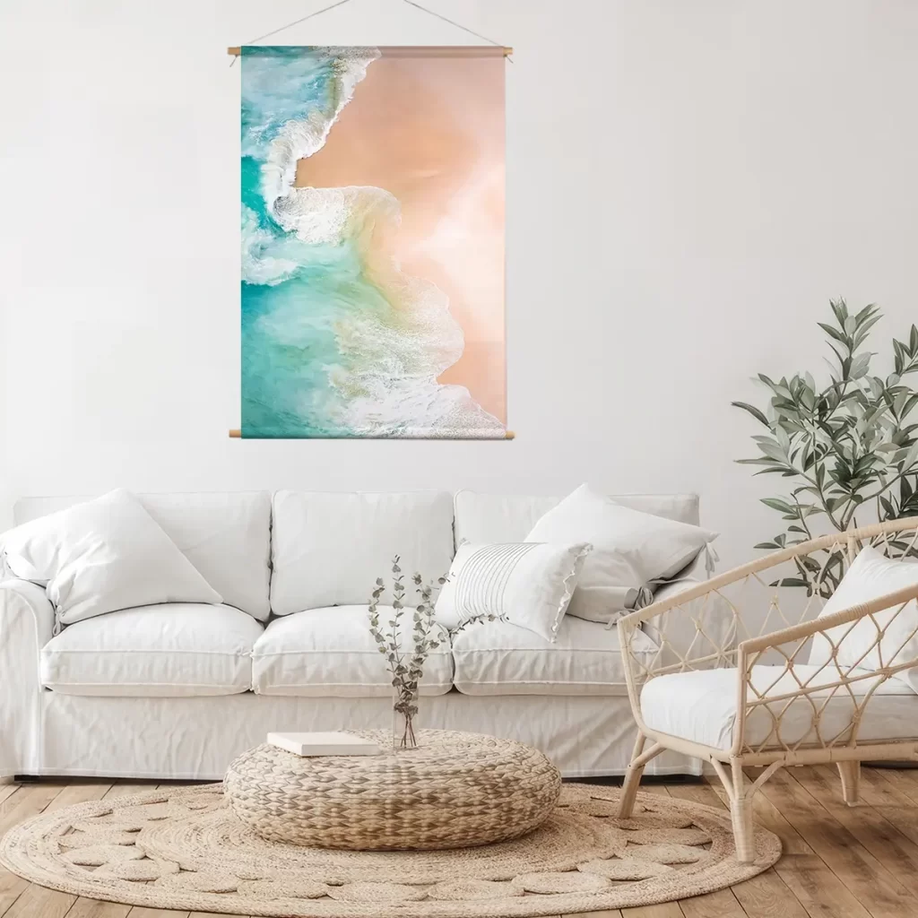 Een spectaculaire luchtfoto waar turquoise oceaanwater het zandstrand ontmoet in een natuurlijk kunstwerk. De levendige contrasten tussen het heldere water en het zachte zand creëren een tropische sfeer die direct vakantiegevoel oproept. Deze print voegt een vleugje luxe en zomerse frisheid toe aan elk interieur.