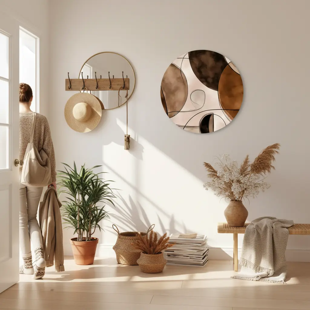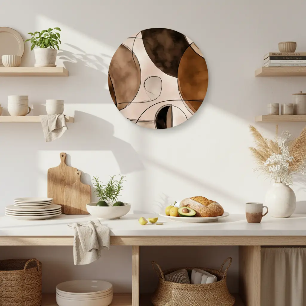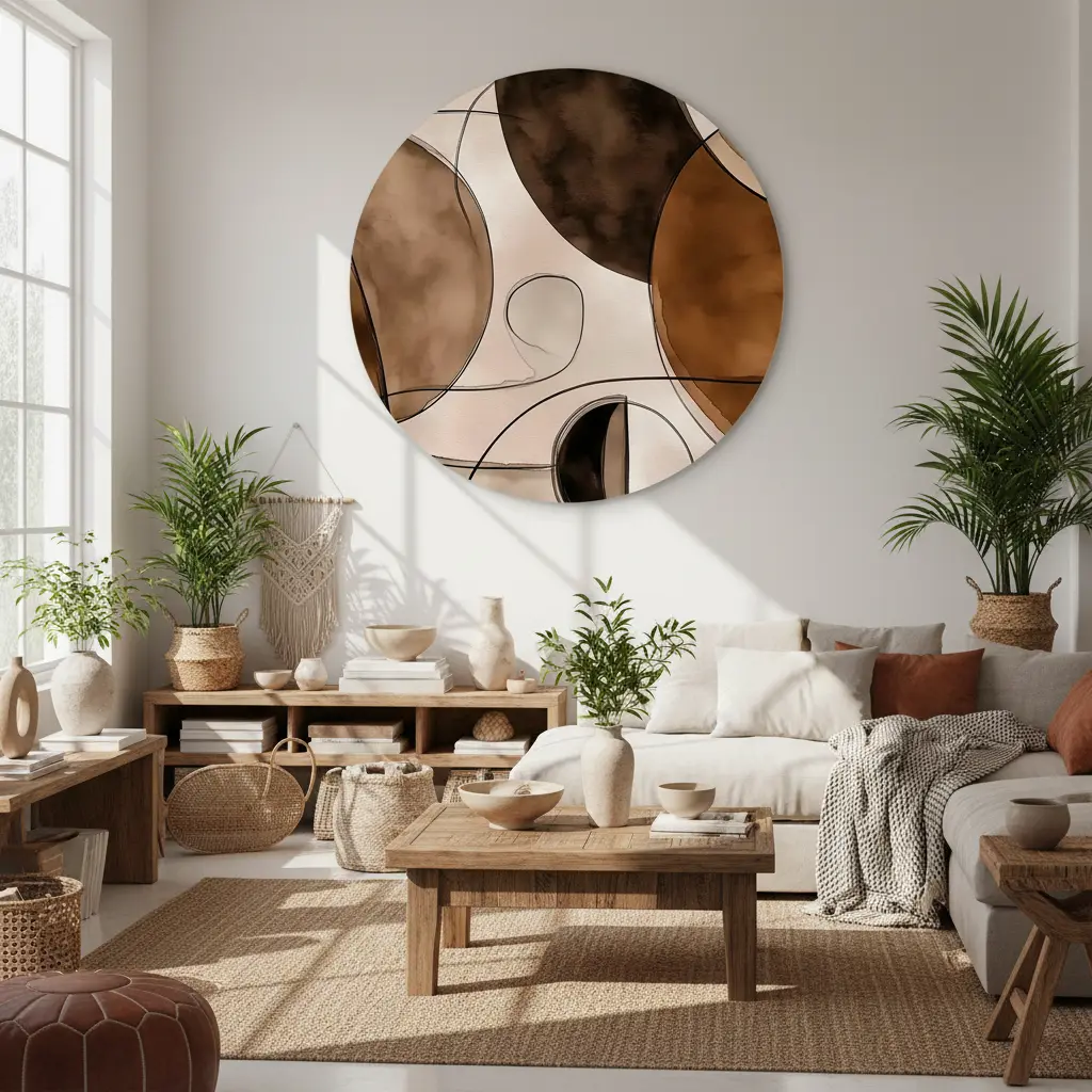 Warme aardetinten en vloeiende lijnen geven deze muurcirkel een rustige, luxe uitstraling. De combinatie van espresso, karamel en zachte zandkleuren maakt ‘m perfect voor een minimalistisch boho interieur met hout, linnen en keramiek. Een subtiele eyecatcher die sfeer toevoegt zonder te overheersen.