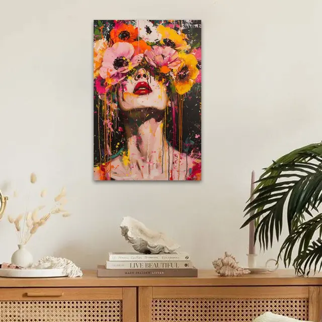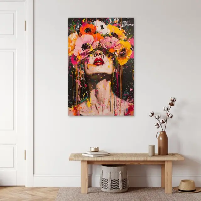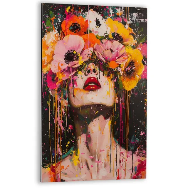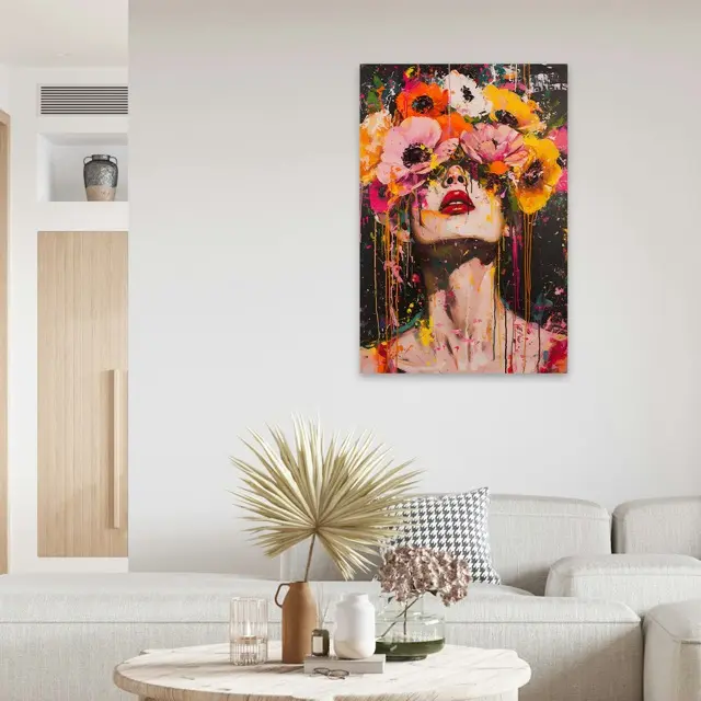 Deze print straalt een energieke en expressieve sfeer uit, door de felle kleuren en de combinatie van een menselijk portret met bloemen. Het werk roept een gevoel van vrijheid en creativiteit op, met de bloemen die de ogen bedekken en de abstracte verfspatten die een dynamisch effect creëren. Als wanddecoratie trekt het onmiddellijk de aandacht en geeft het een ruimte een levendige en artistieke uitstraling.