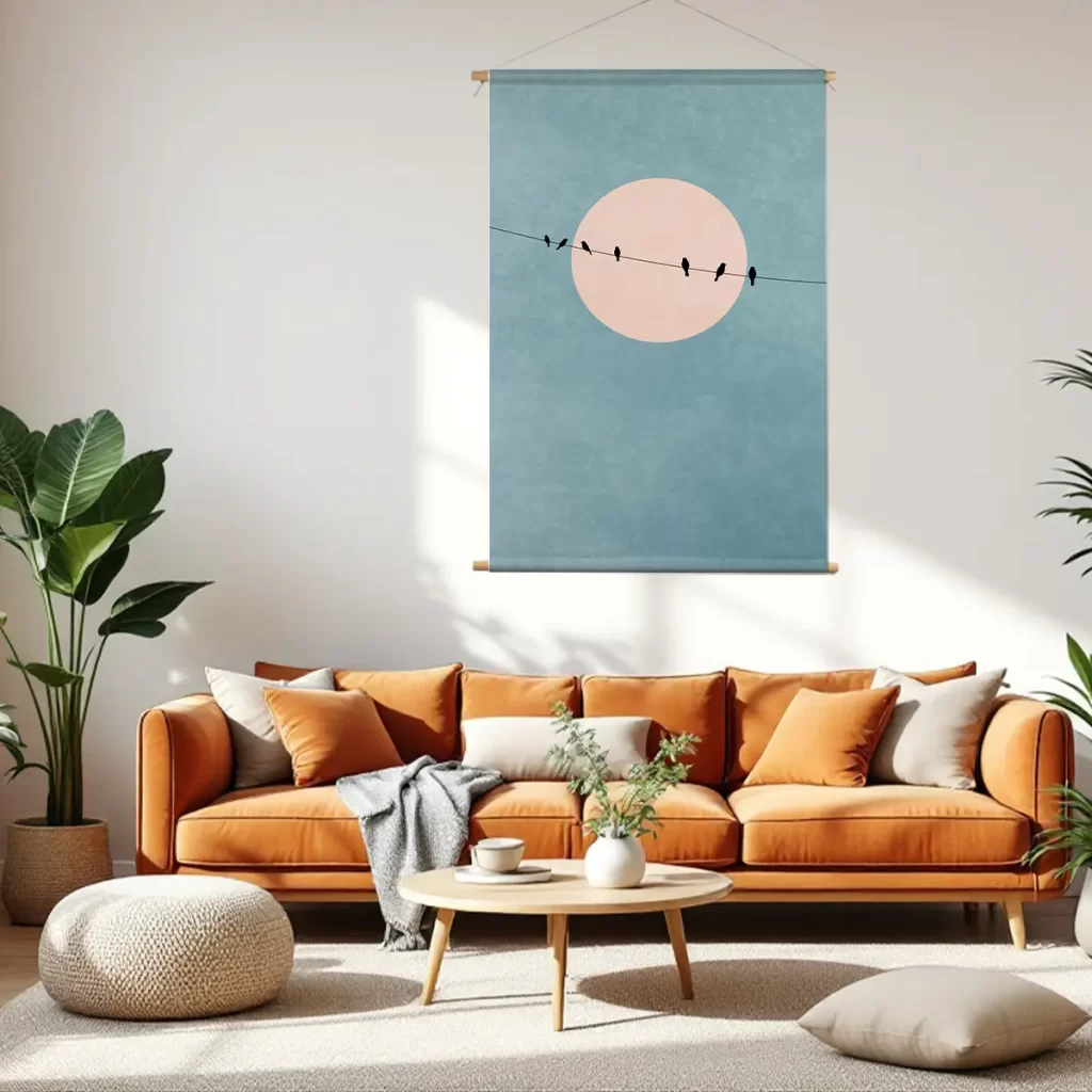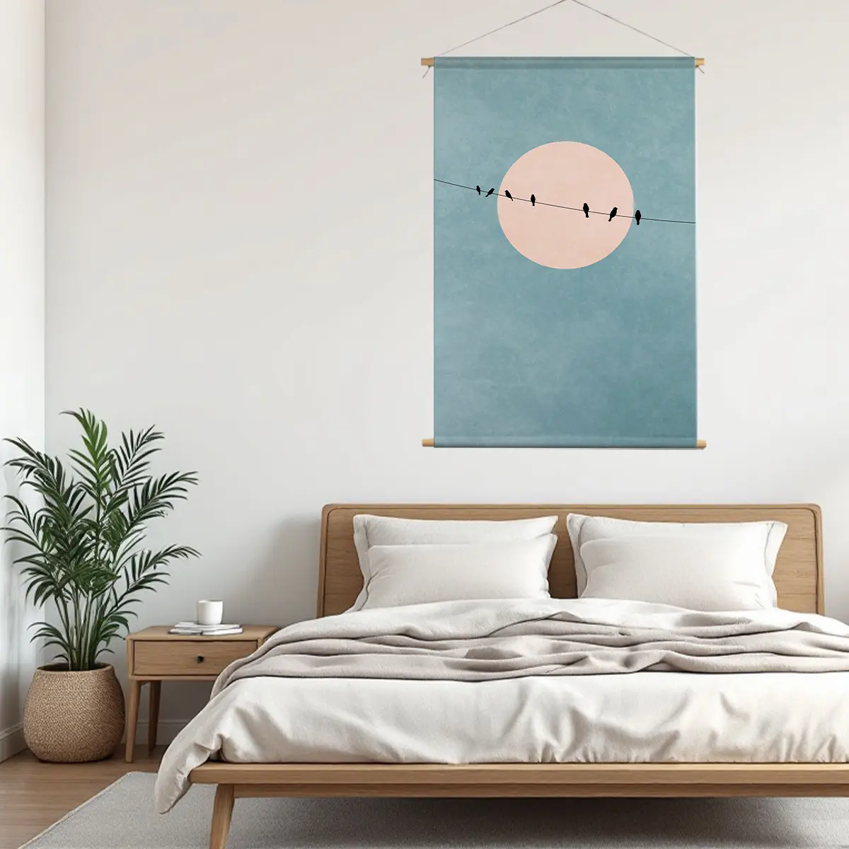 Een serene minimalistische compositie van vogels op takken tegen een zachte pastel zonsondergang. De grote roze zon en de subtiele kleurovergangen van turquoise naar roze creëren een dromerige, rustgevende sfeer. Deze print brengt een gevoel van rust en natuurlijke schoonheid in huis, perfect voor een moderne of Scandinavische inrichting.