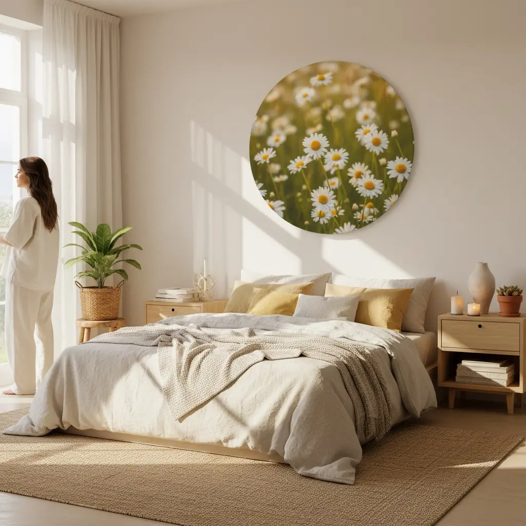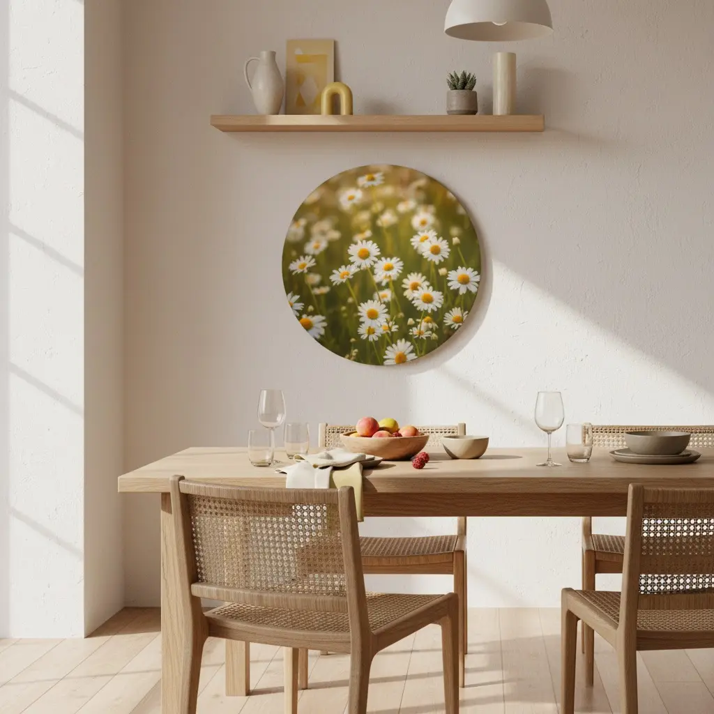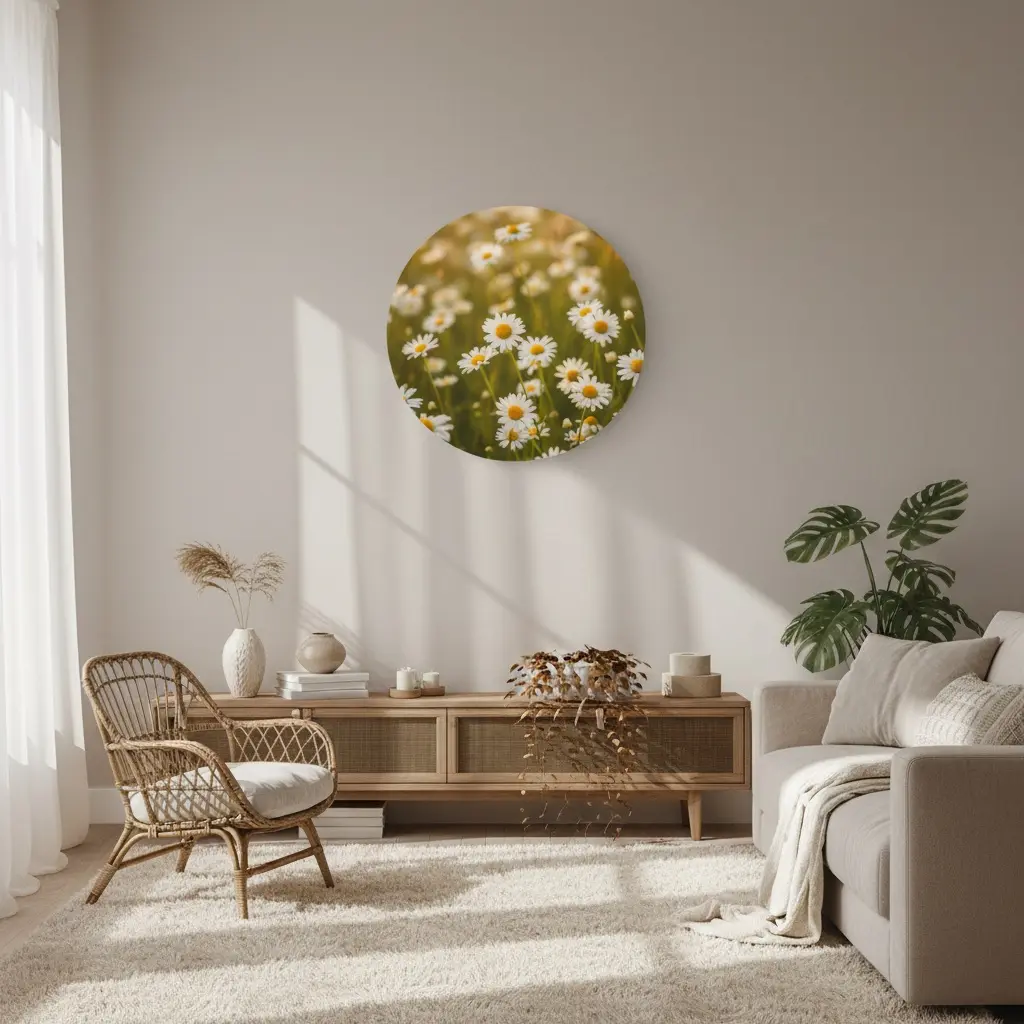 Een frisse fotokunst print van wilde margrieten in zacht zomerlicht, met een dromerige achtergrond en een warme, natuurlijke gloed. De matte fine-art uitstraling en lichte kleuren geven deze muurcirkel een vrolijke, premium look die perfect past bij een boho interieur.