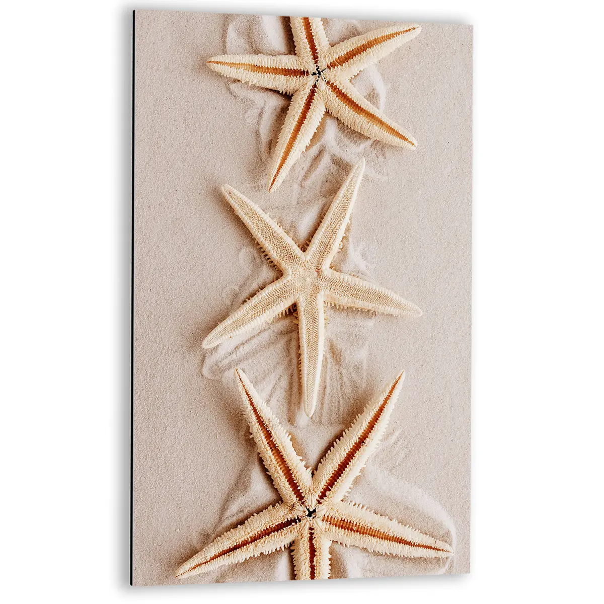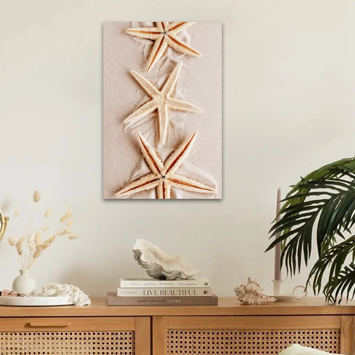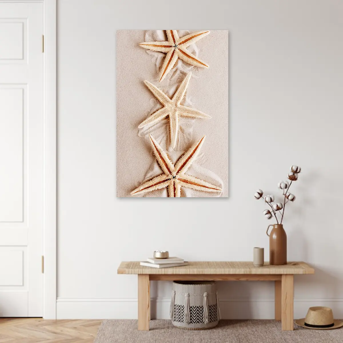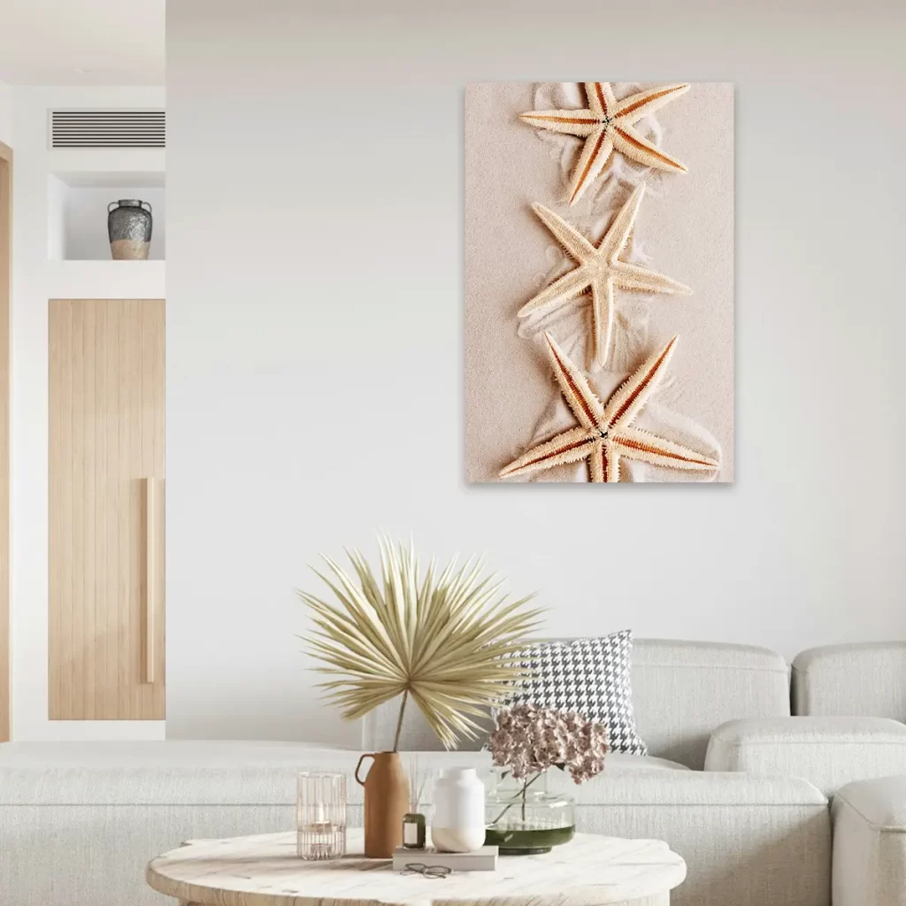 Een rustgevende close-up van delicate zeesterren rustend op fijn, zacht zand. De warme, neutrale tinten en de natuurlijke texturen creëren een serene strandsfeer die direct een gevoel van ontspanning oproept. Als wanddecoratie brengt deze print een vleugje strand en zomer in huis, perfect voor een natuurlijk of kustgeïnspireerd interieur.
