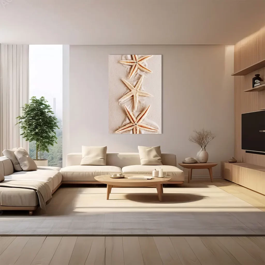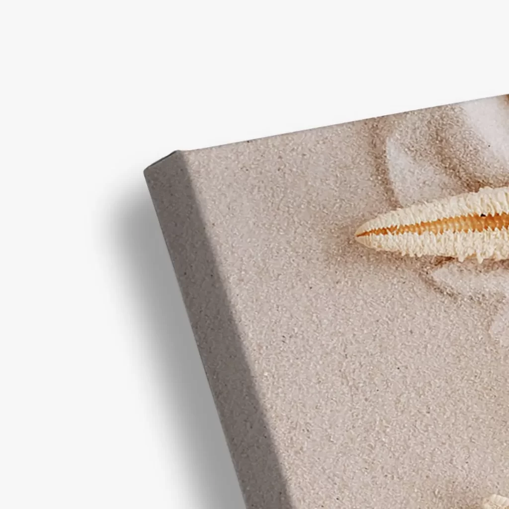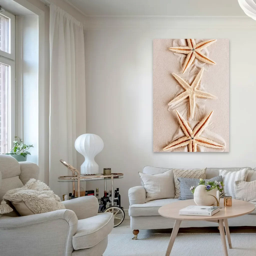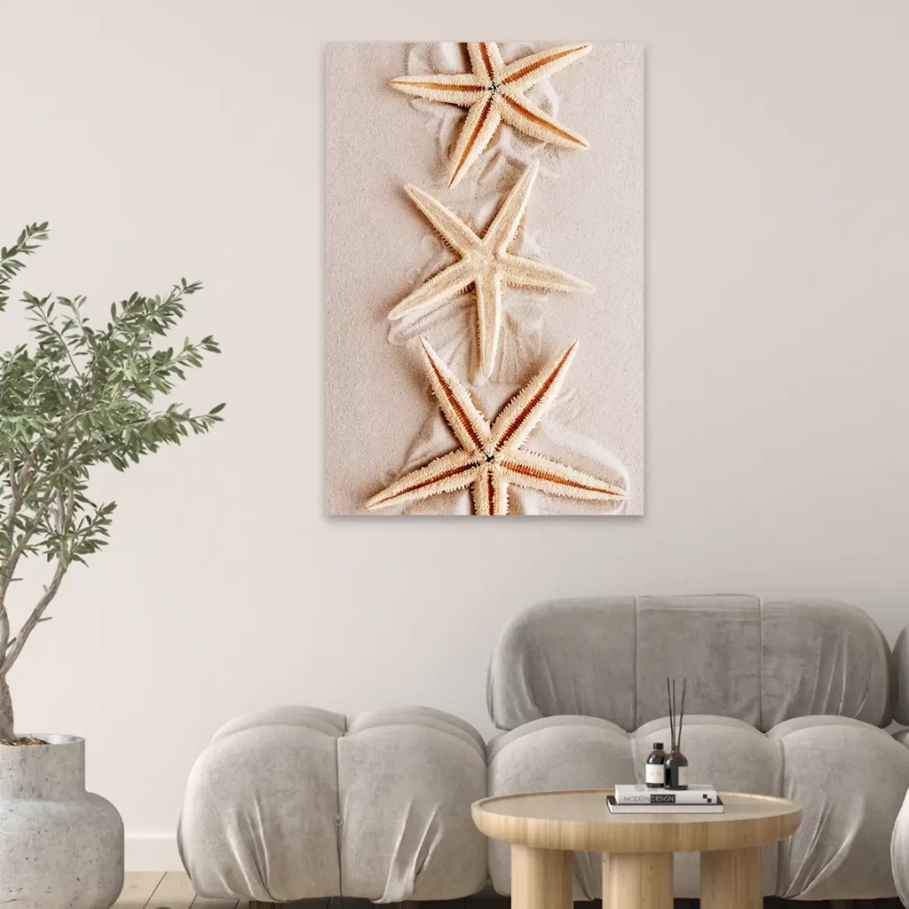 Een rustgevende close-up van delicate zeesterren rustend op fijn, zacht zand. De warme, neutrale tinten en de natuurlijke texturen creëren een serene strandsfeer die direct een gevoel van ontspanning oproept. Als wanddecoratie brengt deze print een vleugje strand en zomer in huis, perfect voor een natuurlijk of kustgeïnspireerd interieur.