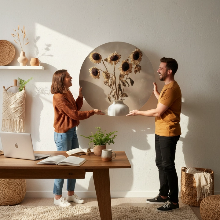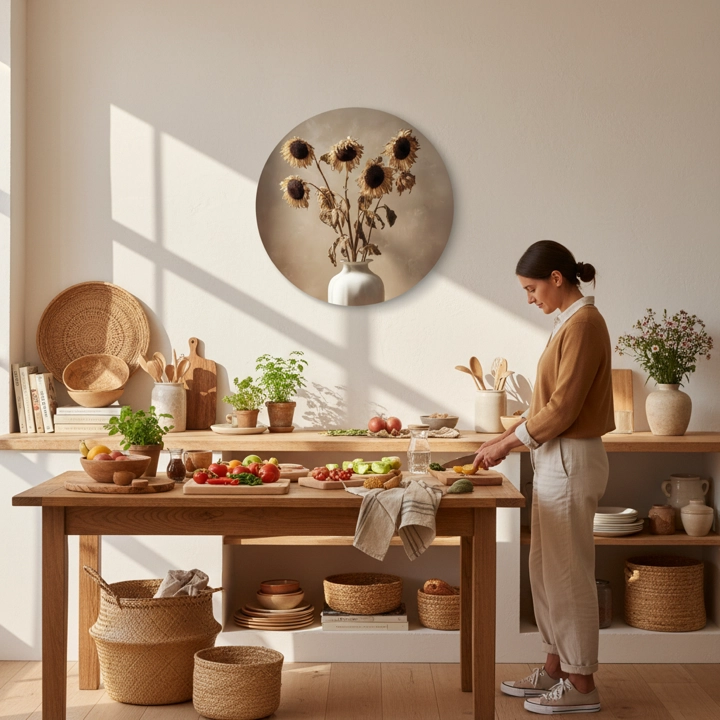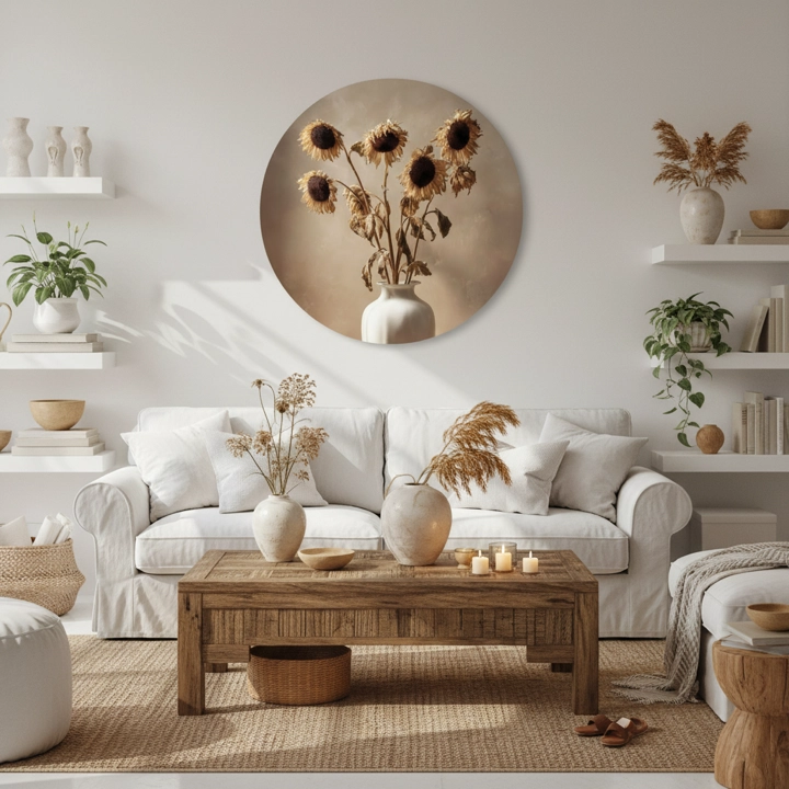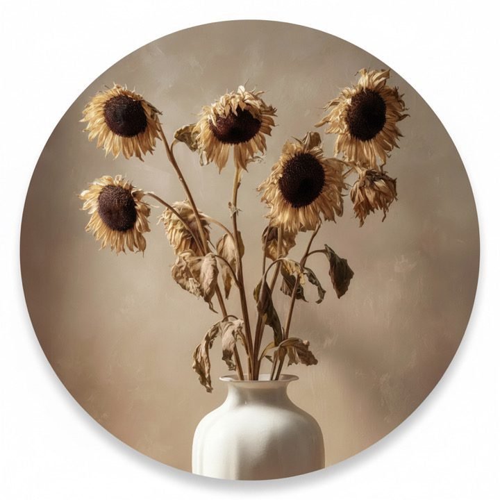 Een krachtige bos zonnebloemen met een mooie, doorleefde uitstraling in een rustige vaas. De warme oker- en zandtinten geven meteen sfeer en maken het beeld extra set-vriendelijk: het voegt warmte toe zonder te overheersen. Ideaal voor een interieur dat gezellig mag aanvoelen, met natuurlijke materialen en zachte aardetinten.