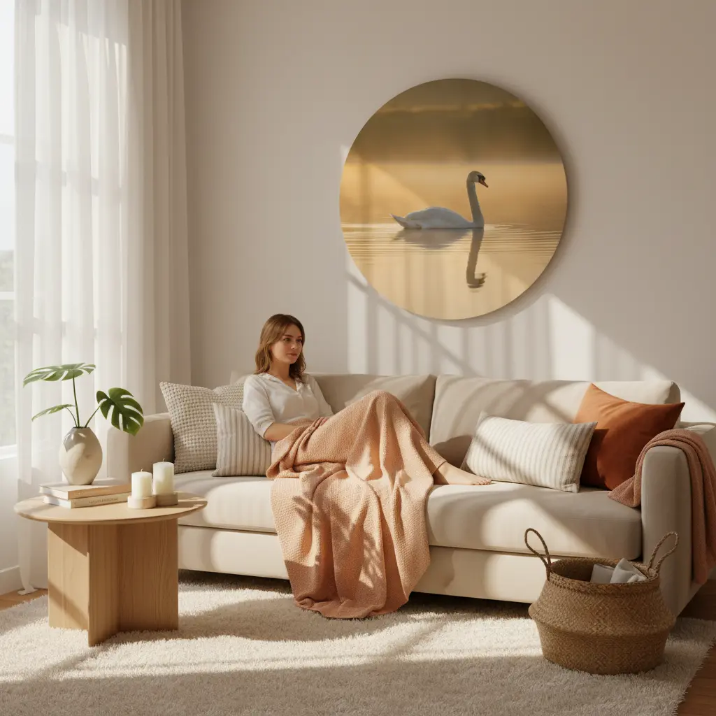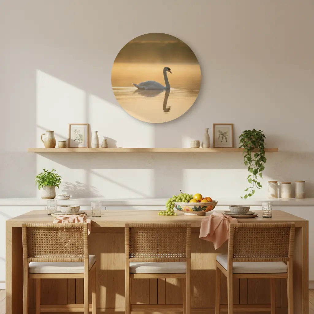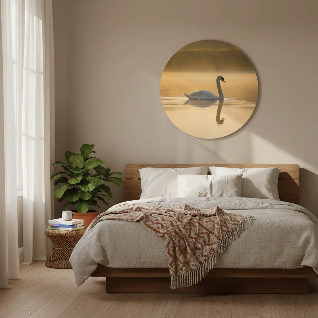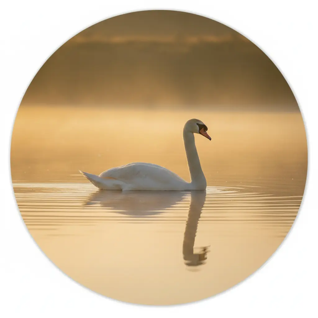 Een serene fotokunst print van een elegante witte zwaan op spiegelstil water, vastgelegd in warm ochtendlicht met een zachte mistige gloed. De rustige compositie en matte fine-art uitstraling geven deze muurcirkel een premium, tijdloze look.